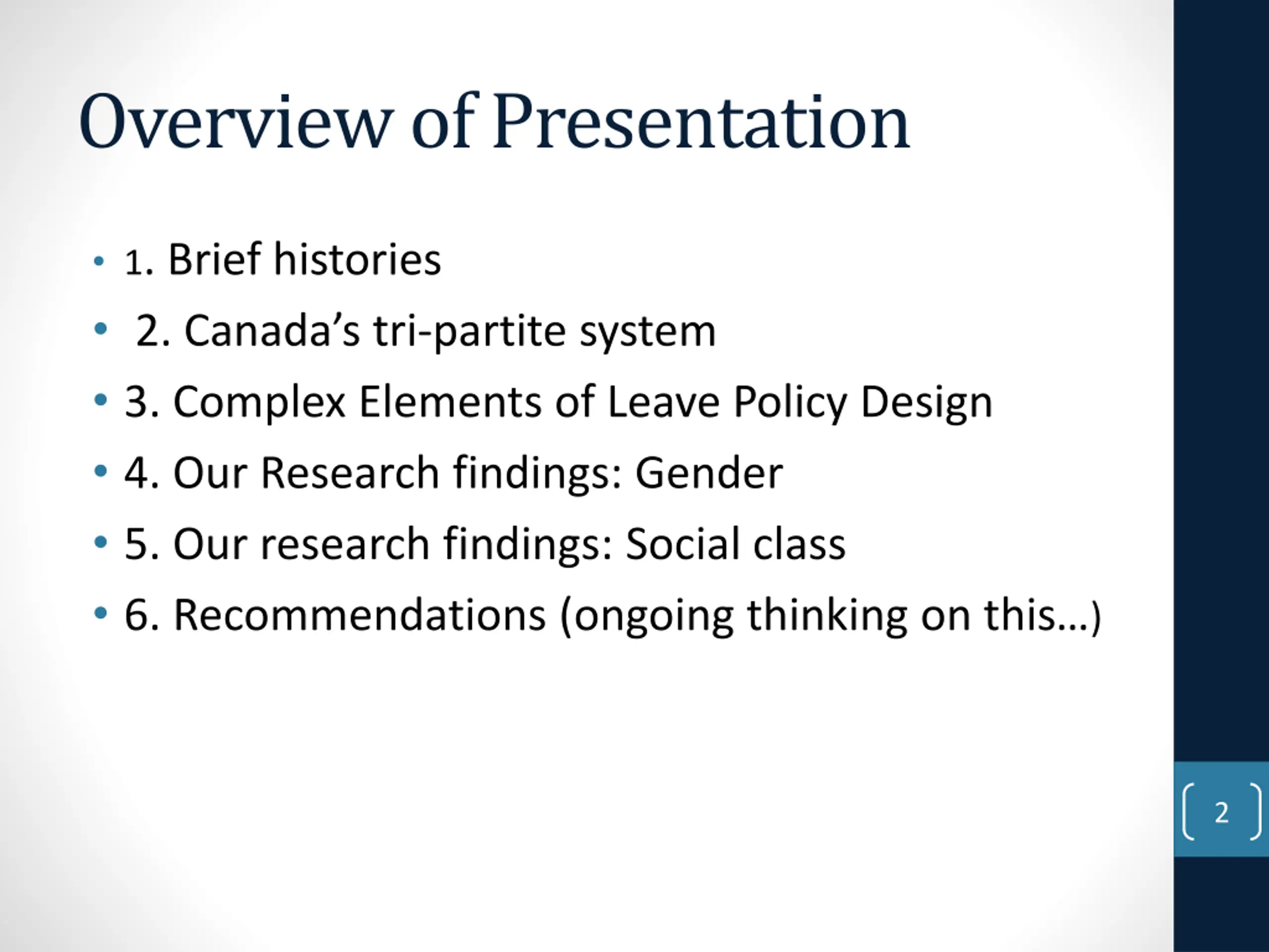 Overview of Presentation 1. Brief histories 2. Canada s tri-partite system 3. Complex Elements of Leave Policy Design 4. Our Research findings: Gender 5. Our research findings: Social class 6. Recommendations (ongoing thinking on this ) 2