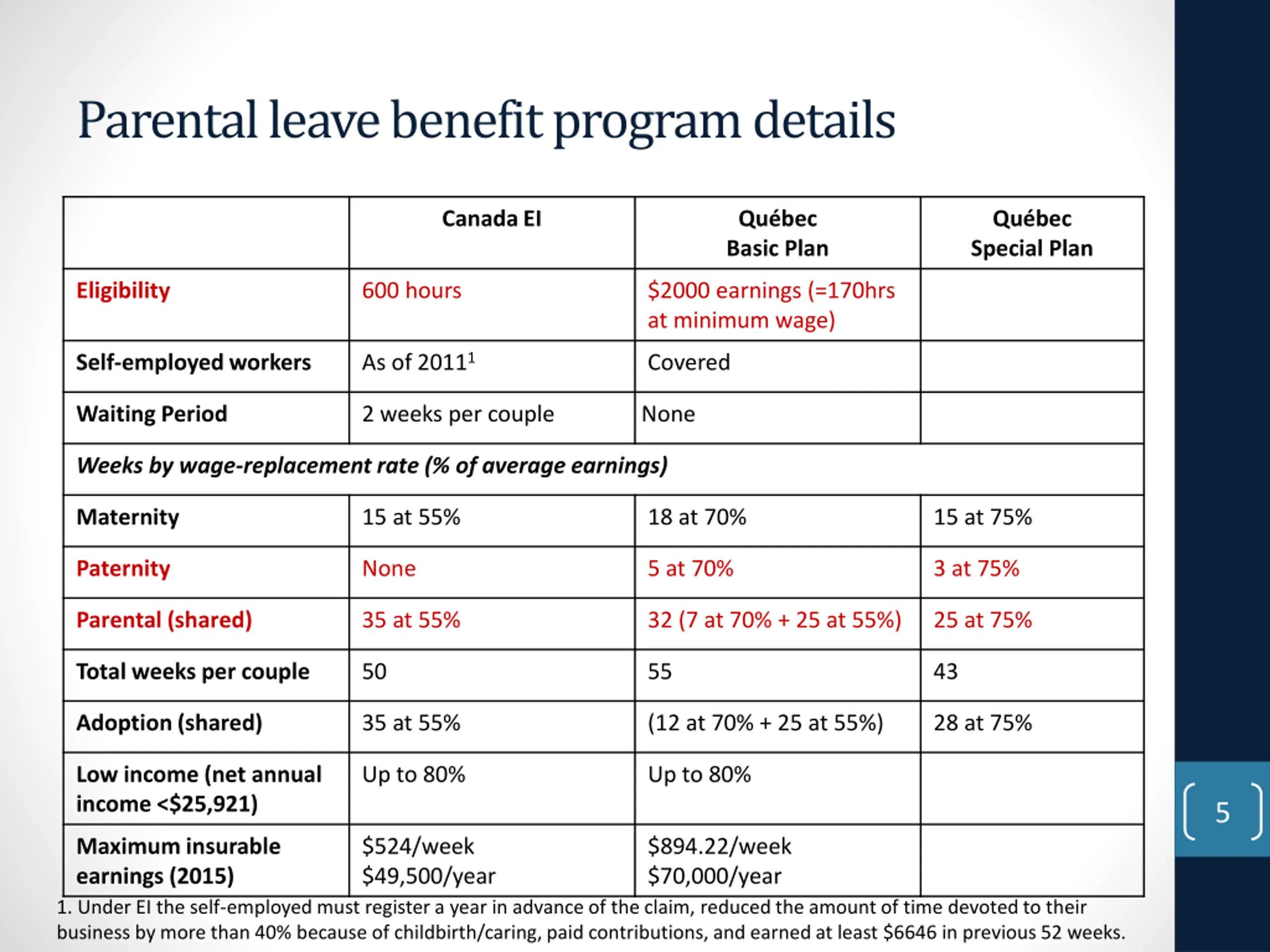 Parental leave benefit program details Canada EI Qu bec Basic Plan Qu bec Special Plan Eligibility 600 hours $2000 earnings (=170hrs at minimum wage) As of 20111 Self-employed workers Covered Waiting Period 2 weeks per couple None Weeks by wage-replacement rate (% of average earnings) Maternity 15 at 55% 18 at 70% 15 at 75% Paternity None 5 at 70% 3 at 75% Parental (shared) 35 at 55% 32 (7 at 70% + 25 at 55%) 25 at 75% Total weeks per couple 50 55 43 Adoption (shared) 35 at 55% (12 at 70% + 25 at 55%) 28 at 75% Low income (net annual income <$25,921) Up to 80% Up to 80% 5 Maximum insurable earnings (2015) 1. Under EI the self-employed must register a year in advance of the claim, reduced the amount of time devoted to their business by more than 40% because of childbirth/caring, paid contributions, and earned at least $6646 in previous 52 weeks. $524/week $49,500/year $894.22/week $70,000/year