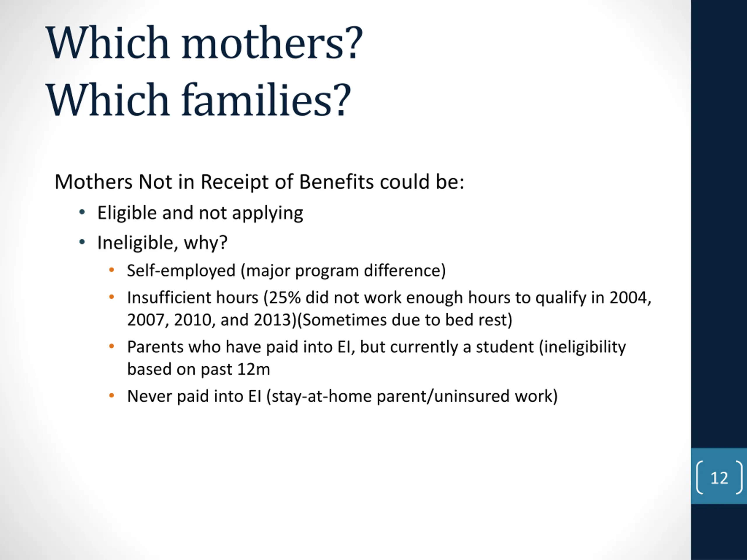 Which mothers? Which families? Mothers Not in Receipt of Benefits could be: Eligible and not applying Ineligible, why? Self-employed (major program difference) Insufficient hours (25% did not work enough hours to qualify in 2004, 2007, 2010, and 2013)(Sometimes due to bed rest) Parents who have paid into EI, but currently a student (ineligibility based on past 12m Never paid into EI (stay-at-home parent/uninsured work) 12