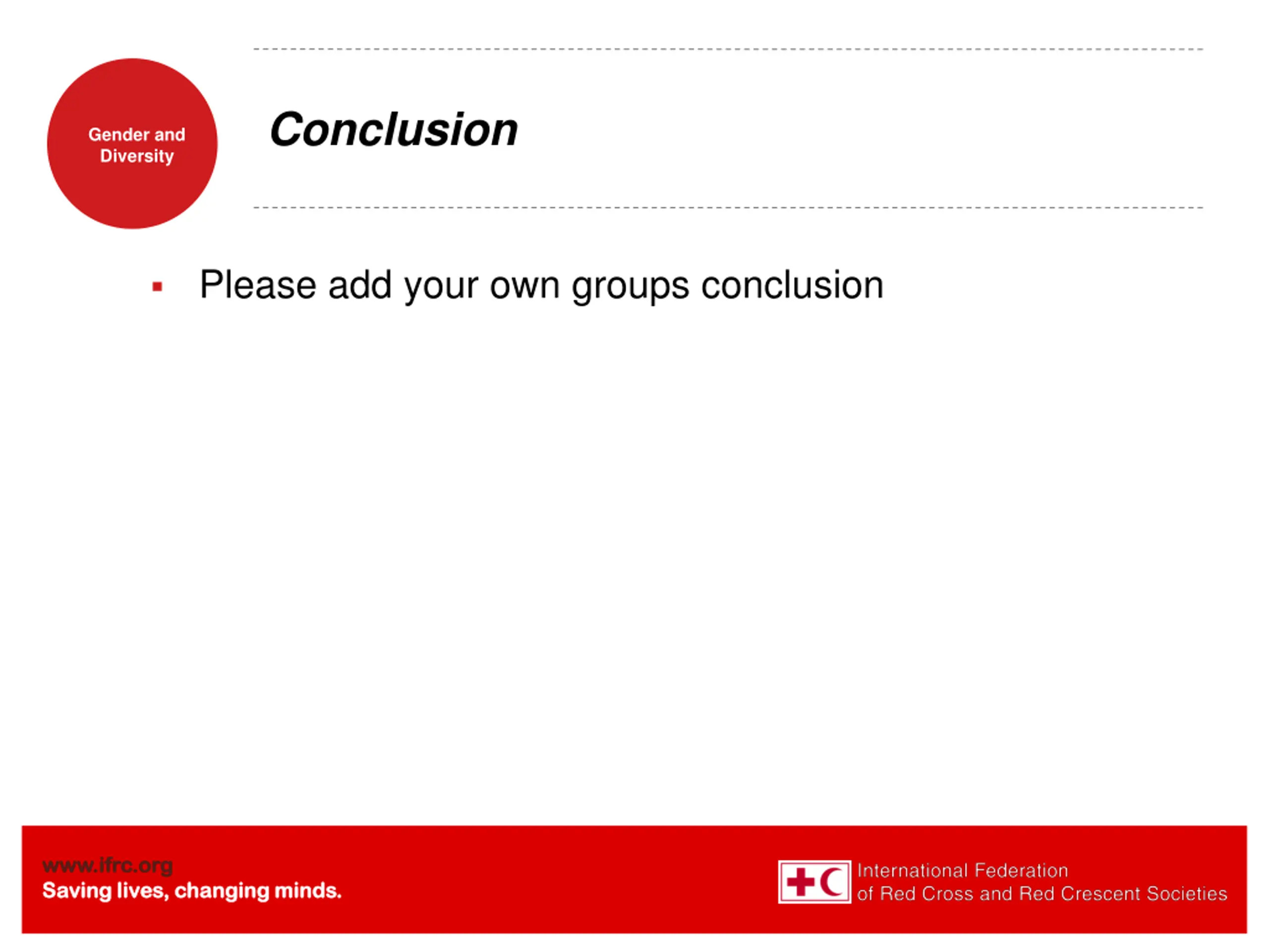 Conclusion Gender and Diversity Please add your own groups conclusion www.ifrc.org www.ifrc.org Saving lives, changing minds. Saving lives, changing minds.