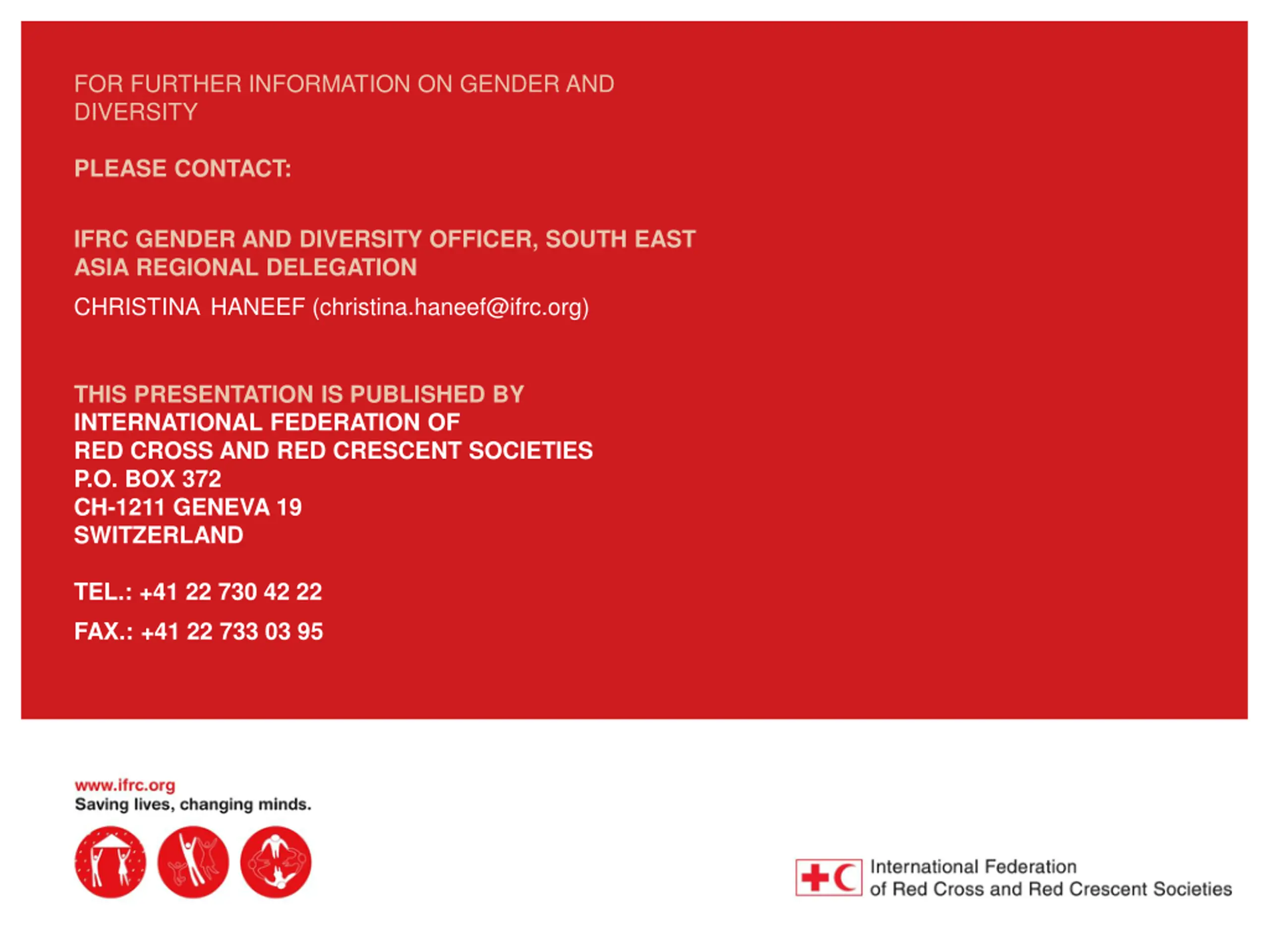 FOR FURTHER INFORMATION ON GENDER AND DIVERSITY PLEASE CONTACT: IFRC GENDER AND DIVERSITY OFFICER, SOUTH EAST ASIA REGIONAL DELEGATION CHRISTINAHANEEF (christina.haneef@ifrc.org) THIS PRESENTATION IS PUBLISHED BY INTERNATIONAL FEDERATION OF RED CROSS AND RED CRESCENT SOCIETIES P.O. BOX 372 CH-1211 GENEVA 19 SWITZERLAND TEL.: +41 22 730 42 22 FAX.: +41 22 733 03 95