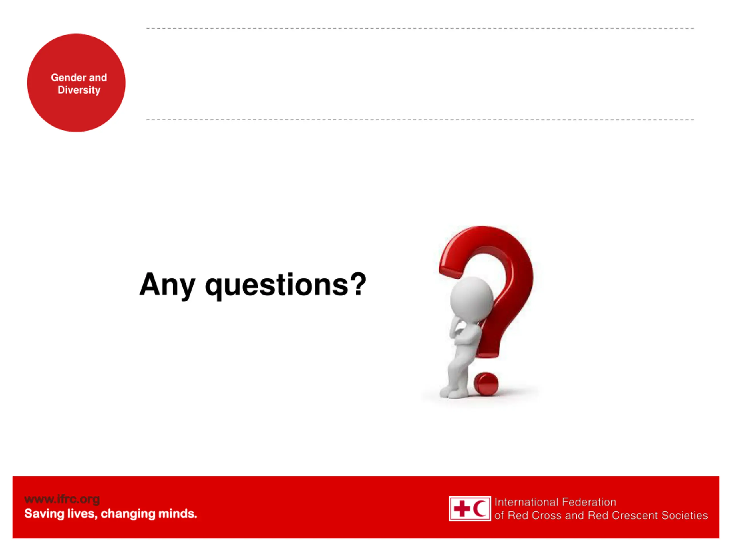 Gender and Diversity Any questions? www.ifrc.org www.ifrc.org Saving lives, changing minds. Saving lives, changing minds.