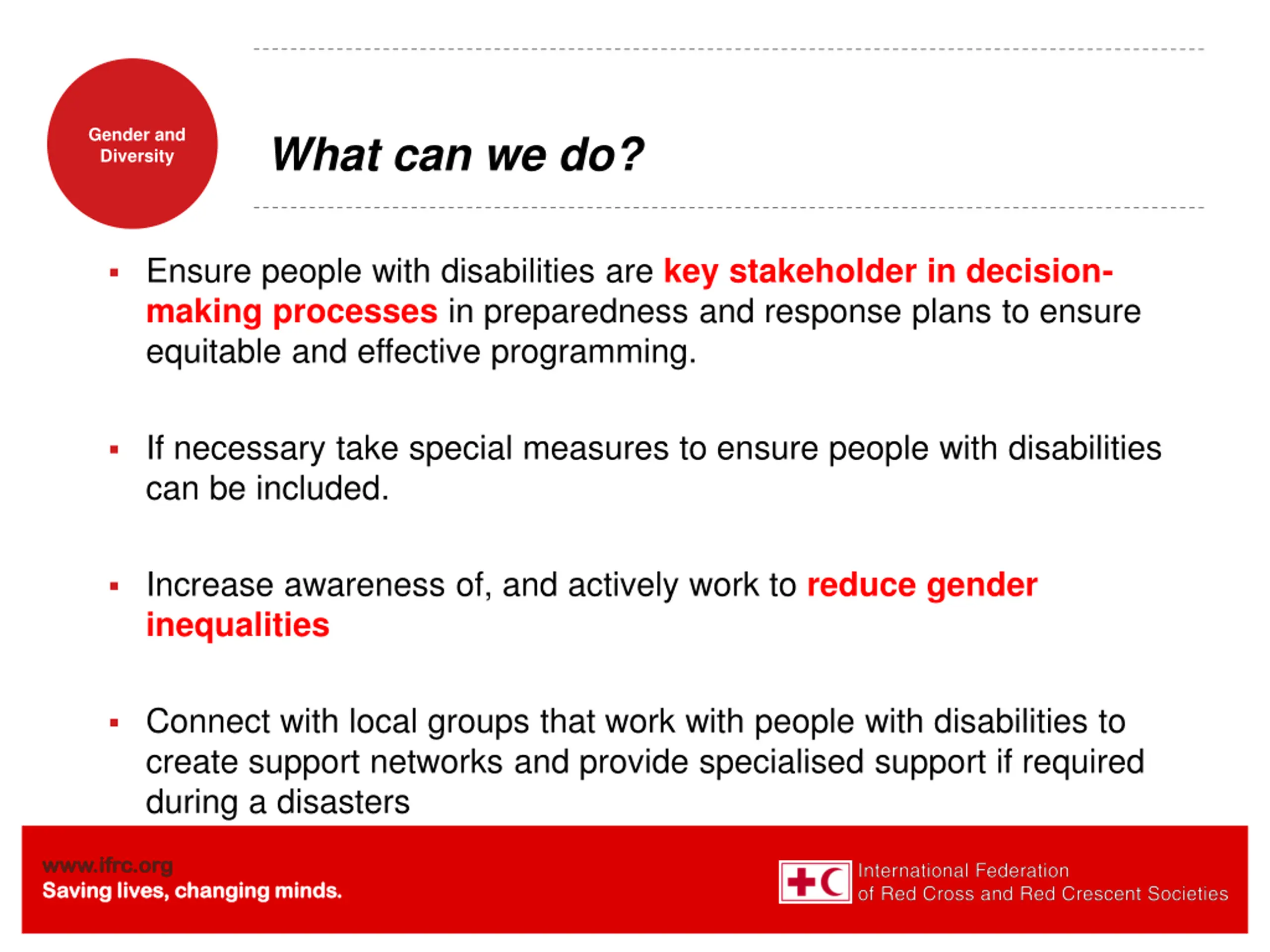 Gender and Diversity What can we do? Ensure people with disabilities are key stakeholder in decision- making processes in preparedness and response plans to ensure equitable and effective programming. If necessary take special measures to ensure people with disabilities can be included. Increase awareness of, and actively work to reduce gender inequalities Connect with local groups that work with people with disabilities to create support networks and provide specialised support if required during a disasters www.ifrc.org www.ifrc.org Saving lives, changing minds. Saving lives, changing minds.