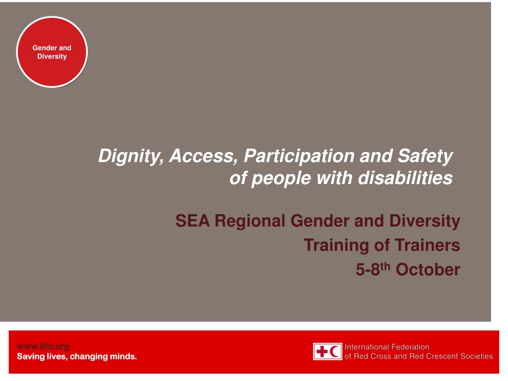 Gender and Gender and Diversity Diversity Dignity, Access, Participation and Safety of people with disabilities SEA Regional Gender and Diversity Training of Trainers 5-8th October www.ifrc.org www.ifrc.org Saving lives, changing minds. Saving lives, changing minds.