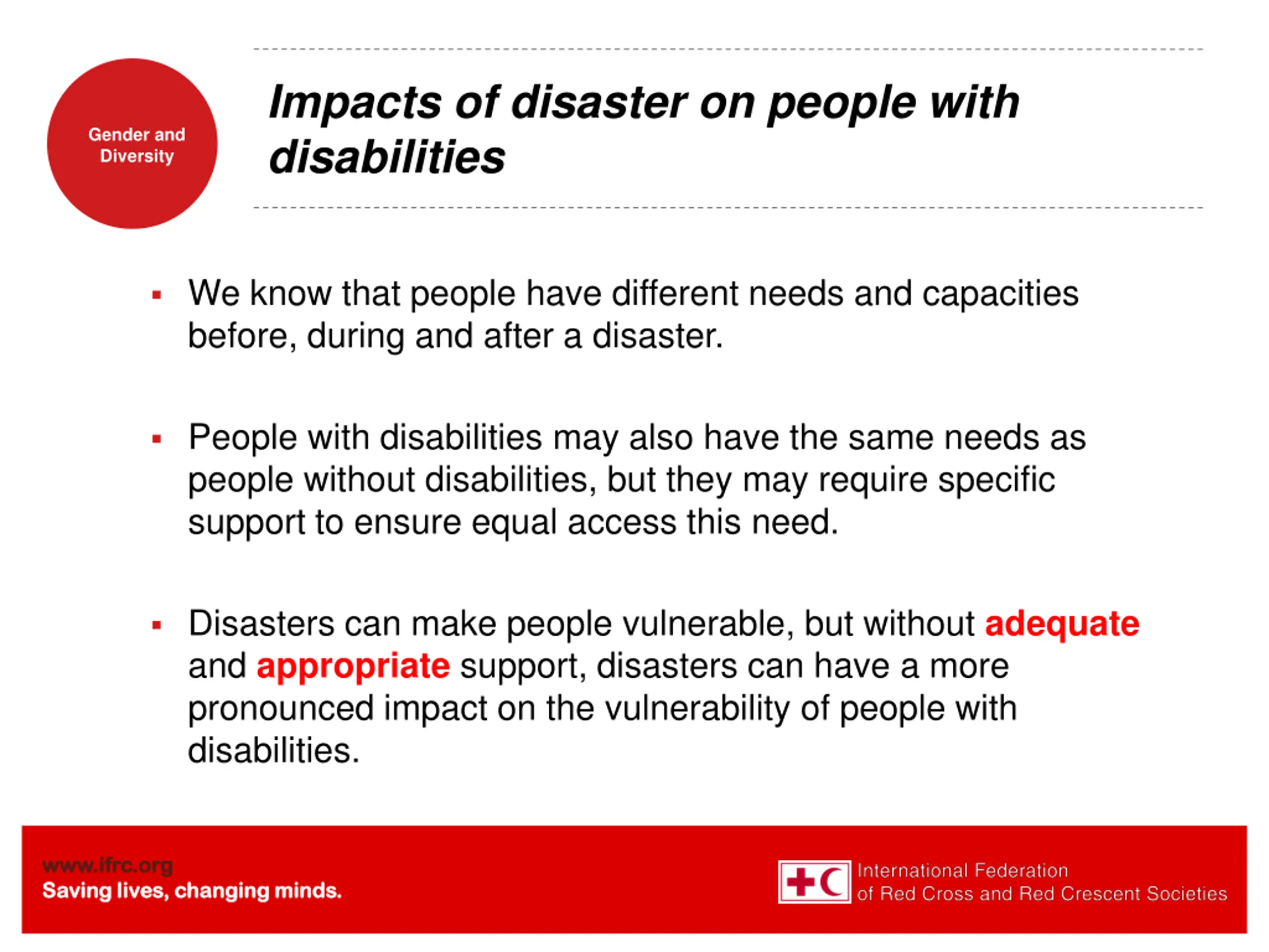 Impacts of disaster on people with disabilities Gender and Diversity We know that people have different needs and capacities before, during and after a disaster. People with disabilities may also have the same needs as people without disabilities, but they may require specific support to ensure equal access this need. Disasters can make people vulnerable, but without adequate and appropriate support, disasters can have a more pronounced impact on the vulnerability of people with disabilities. www.ifrc.org www.ifrc.org Saving lives, changing minds. Saving lives, changing minds.