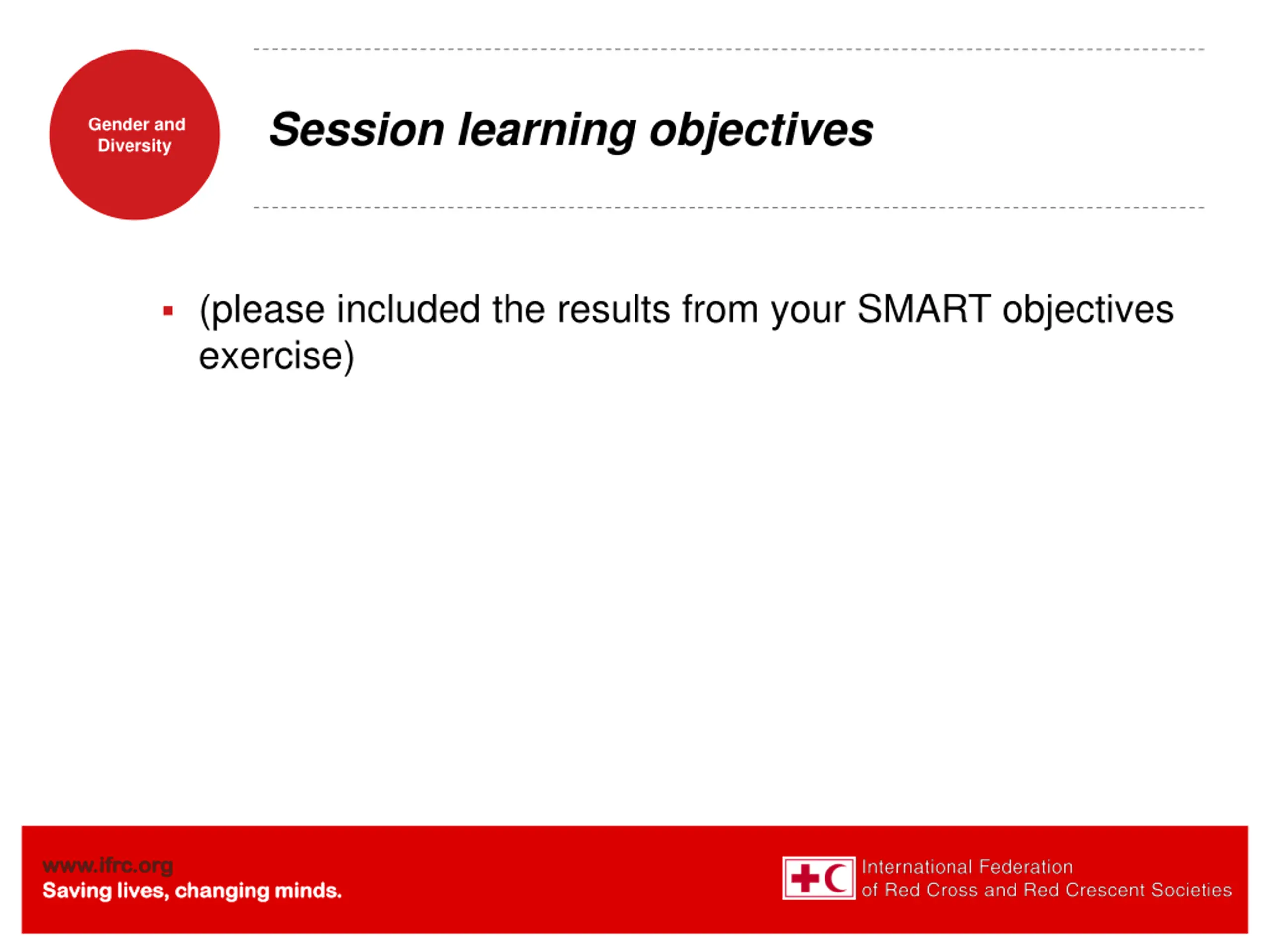 Session learning objectives Gender and Diversity (please included the results from your SMART objectives exercise) www.ifrc.org www.ifrc.org Saving lives, changing minds. Saving lives, changing minds.