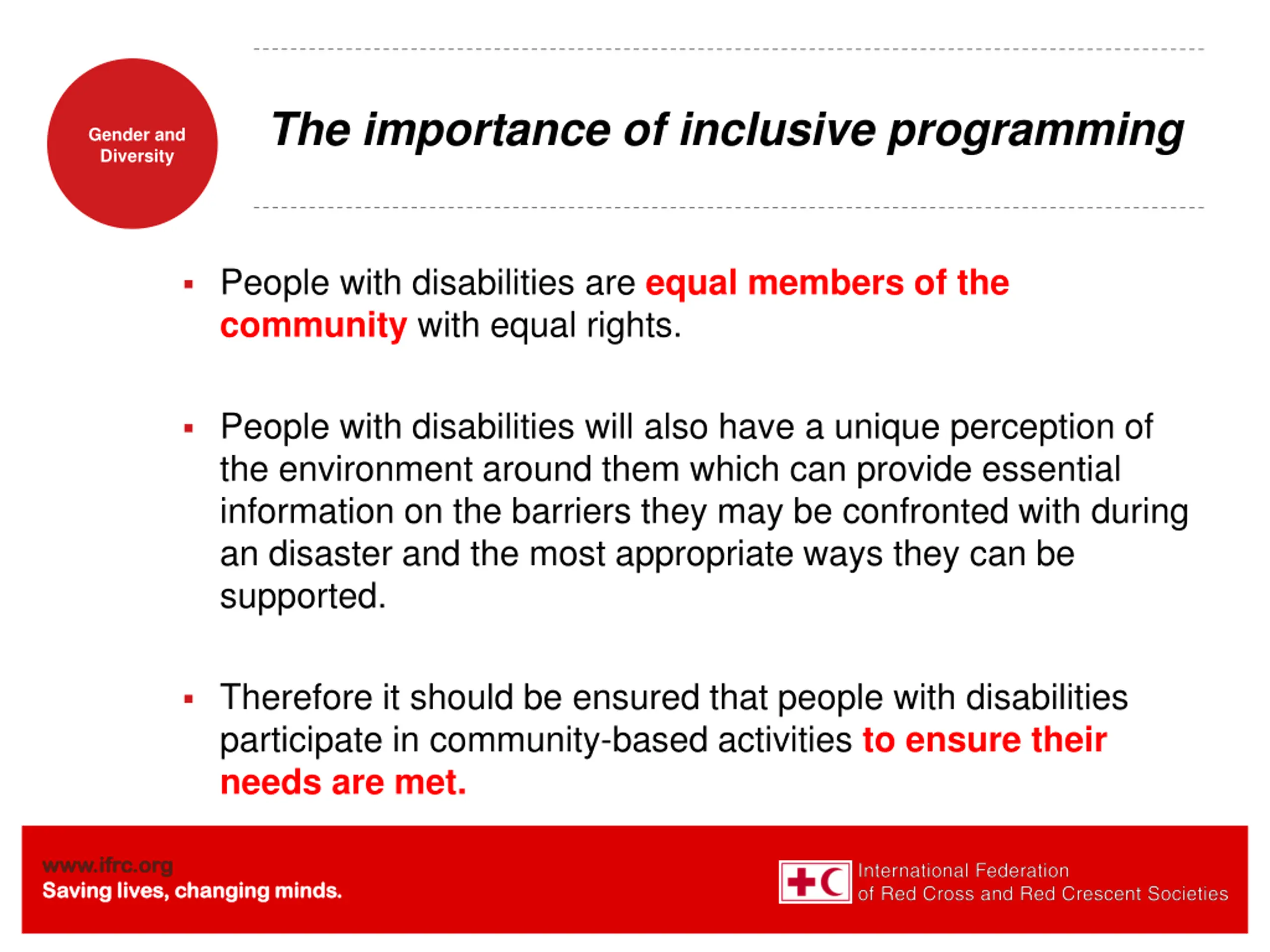 The importance of inclusive programming Gender and Diversity People with disabilities are equal members of the community with equal rights. People with disabilities will also have a unique perception of the environment around them which can provide essential information on the barriers they may be confronted with during an disaster and the most appropriate ways they can be supported. Therefore it should be ensured that people with disabilities participate in community-based activities to ensure their needs are met. www.ifrc.org www.ifrc.org Saving lives, changing minds. Saving lives, changing minds.