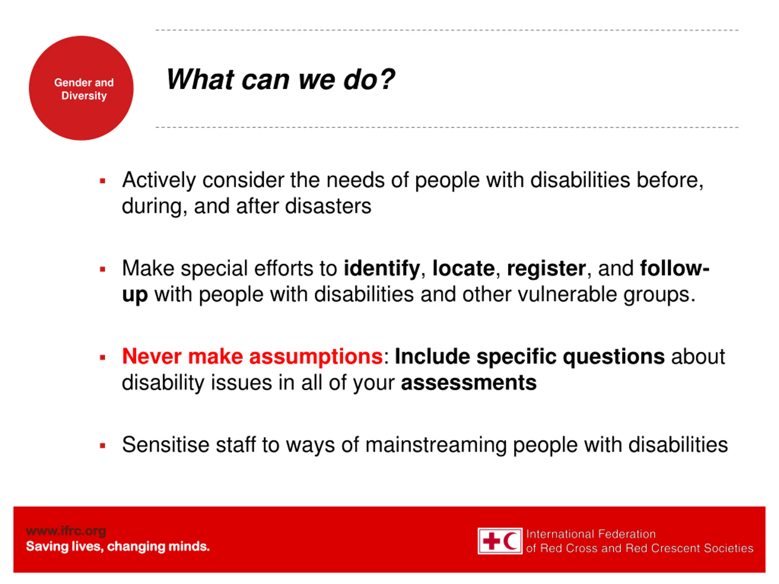 What can we do? Gender and Diversity Actively consider the needs of people with disabilities before, during, and after disasters Make special efforts to identify, locate, register, and follow- up withpeople with disabilities and other vulnerable groups. Never make assumptions: Include specific questions about disability issues in all of your assessments Sensitise staff to ways of mainstreaming people with disabilities www.ifrc.org www.ifrc.org Saving lives, changing minds. Saving lives, changing minds.