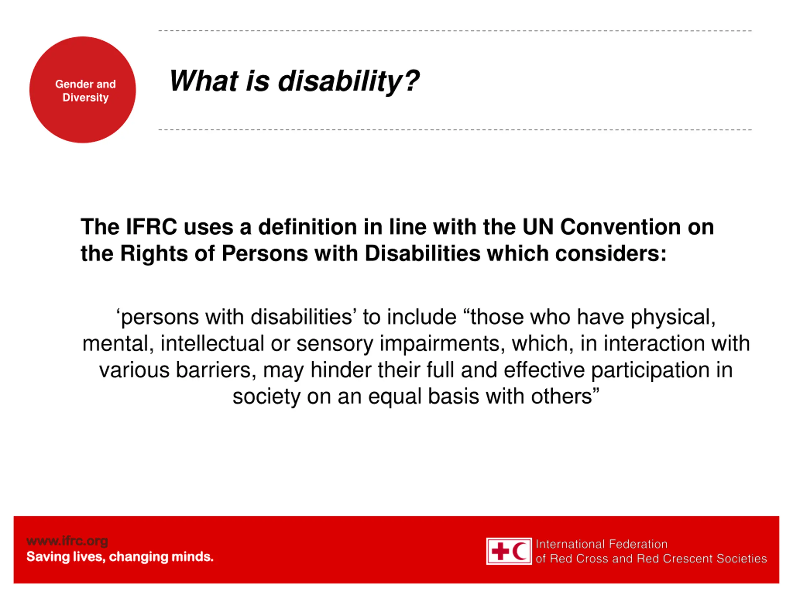What is disability? Gender and Diversity The IFRC uses a definition in line with the UN Convention on the Rights of Persons with Disabilities which considers: persons with disabilities to include those who have physical, mental, intellectual or sensory impairments, which, in interaction with various barriers, may hinder their full and effective participation in society on an equal basis with others www.ifrc.org www.ifrc.org Saving lives, changing minds. Saving lives, changing minds.