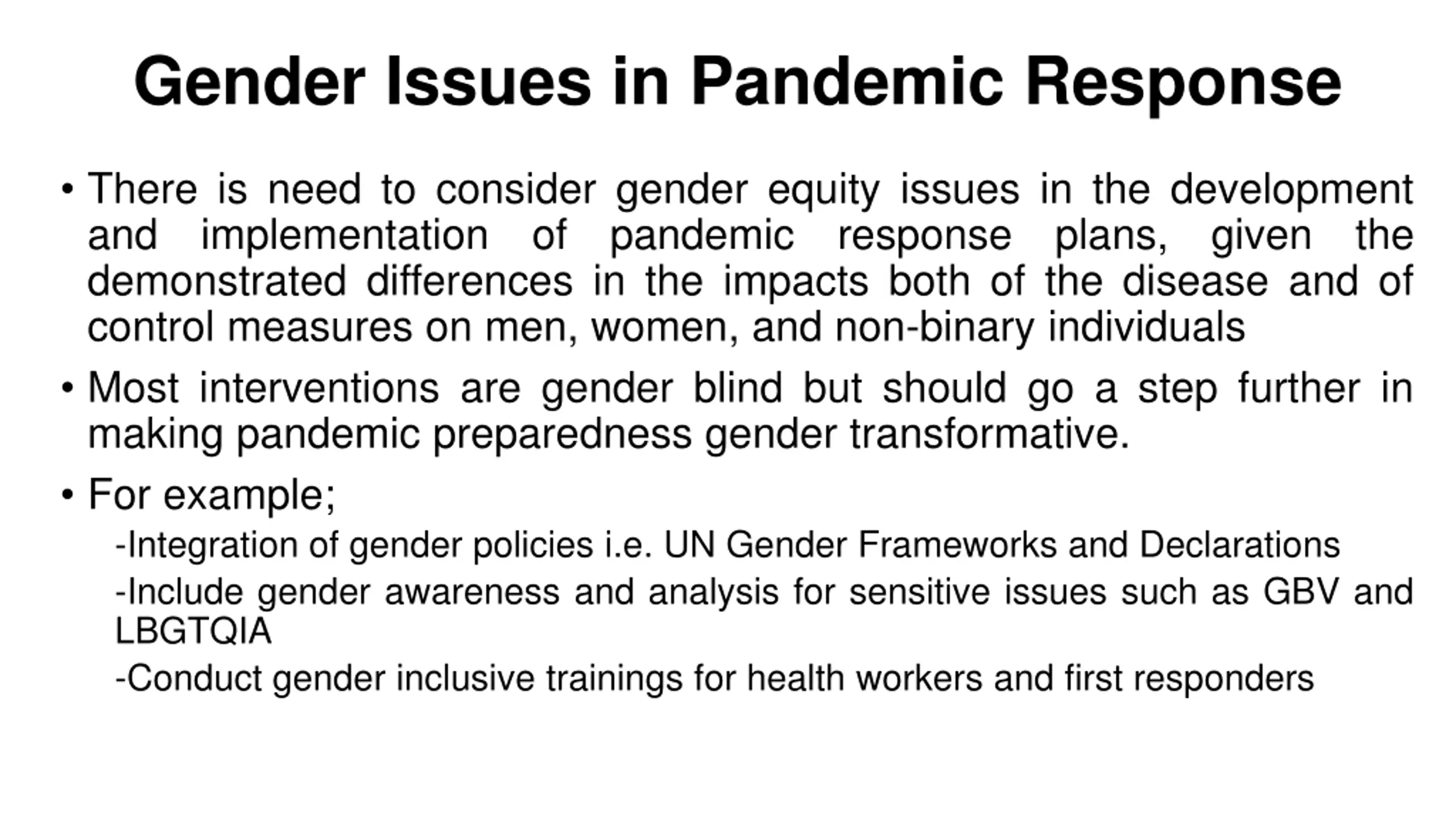 Gender Issues in Pandemic Response There is need to consider gender equity issues in the development and implementation of pandemic response plans, given the demonstrated differences in the impacts both of the disease and of control measures on men, women, and non-binary individuals Most interventions are gender blind but should go a step further in making pandemic preparedness gender transformative. For example; -Integration of gender policies i.e. UN Gender Frameworks and Declarations -Include gender awareness and analysis for sensitive issues such as GBV and LBGTQIA -Conduct gender inclusive trainings for health workers and first responders