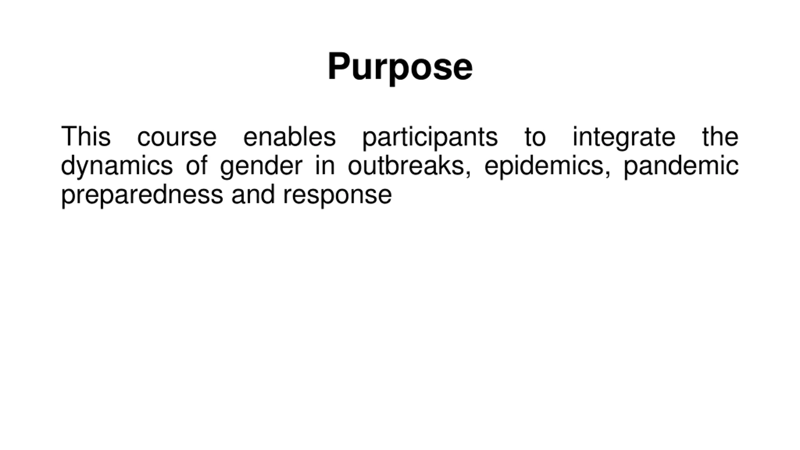 Expected Learning Outcomes By the end of this course participants should be able to Explain gender, sex, power relations and gender inequities in society and how they influence pandemics Discuss concepts of inequality and inequity with regard to preparedness and response for disease outbreaks Justify the case for mainstreaming gender and ethics in pandemics preparedness and response Assess the contribution pandemics response of ethical considerations in