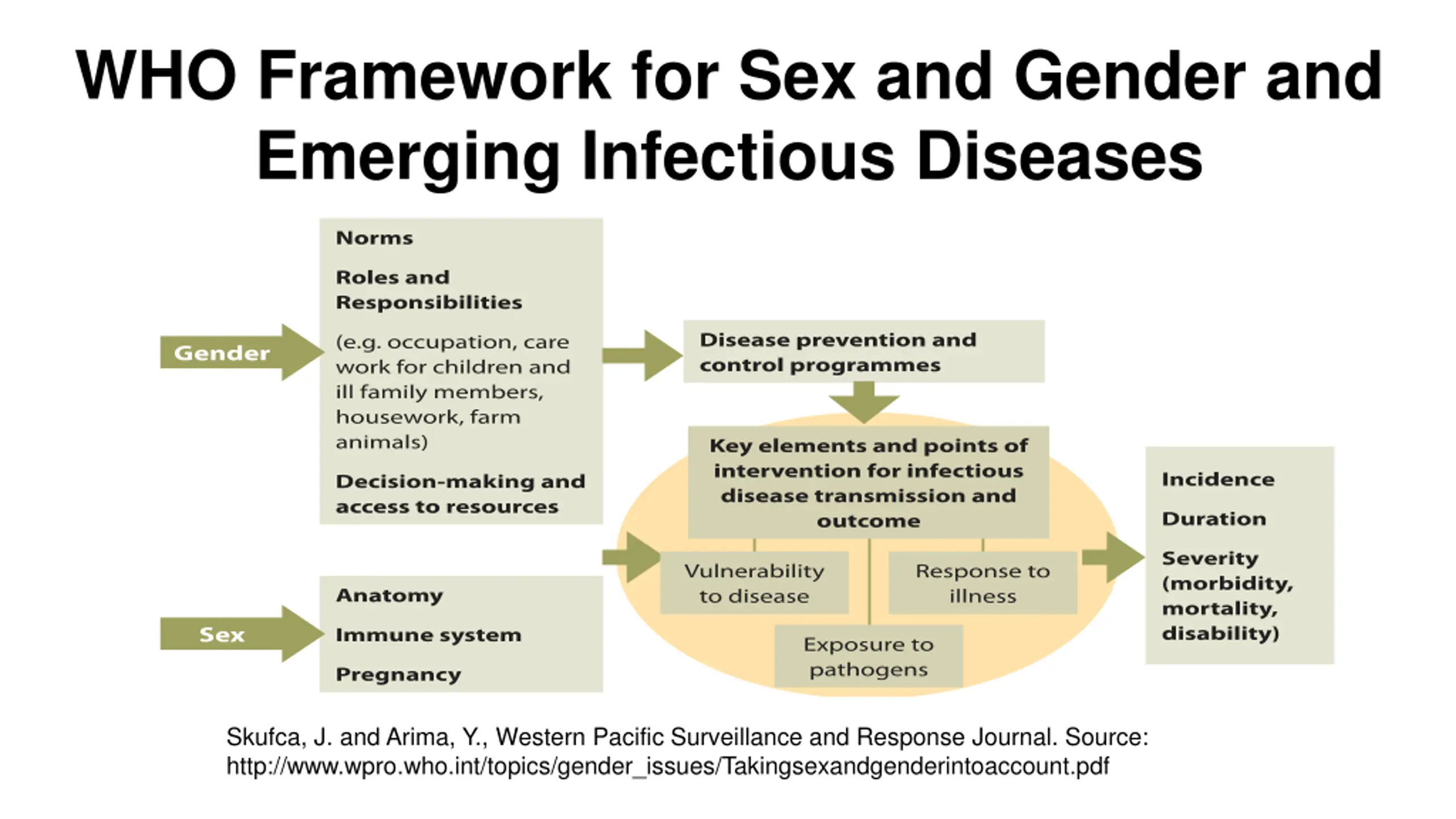 WHO Framework for Sex and Gender and Emerging Infectious Diseases Skufca, J. and Arima, Y., Western Pacific Surveillance and Response Journal. Source: http://www.wpro.who.int/topics/gender_issues/Takingsexandgenderintoaccount.pdf