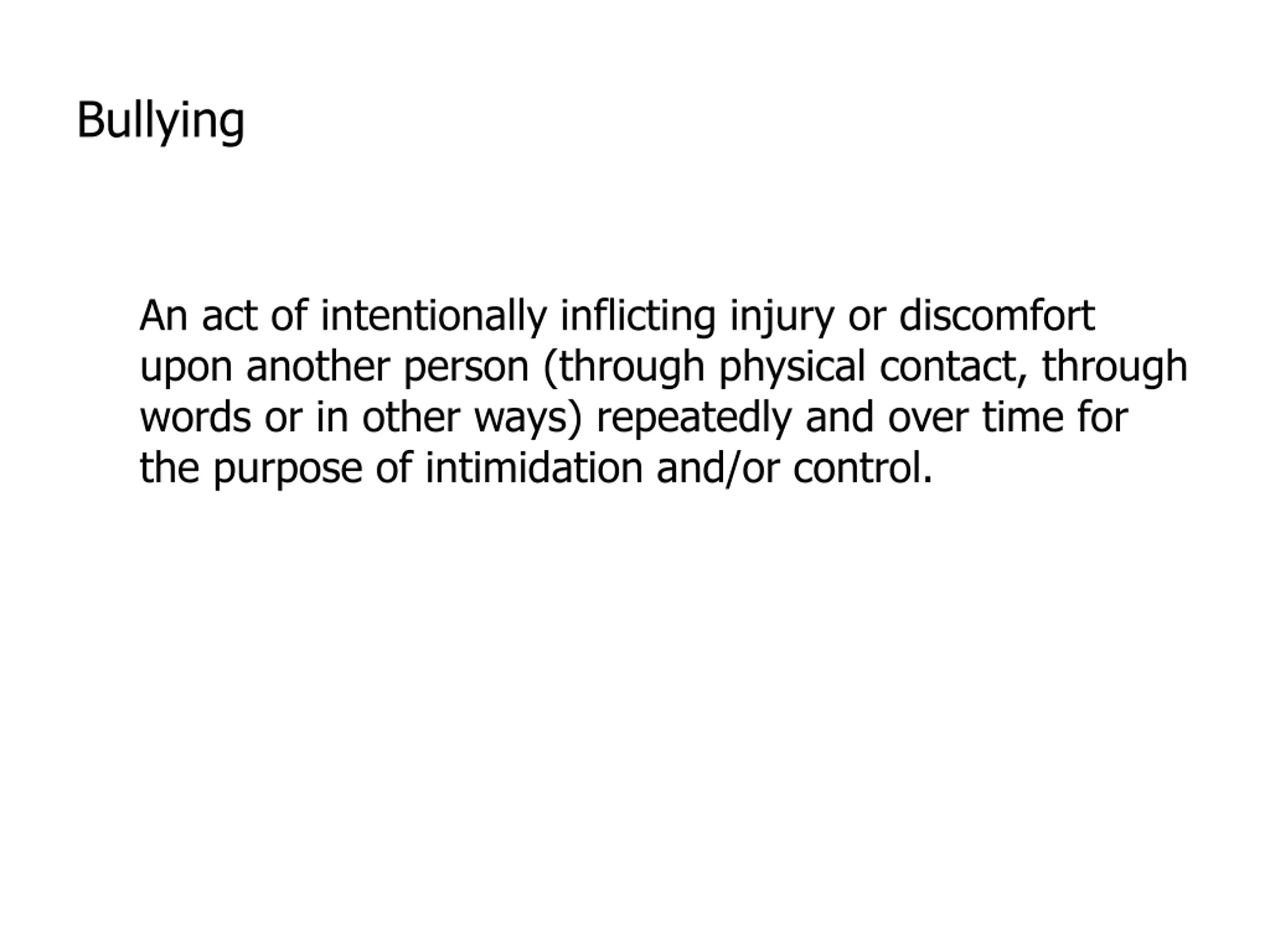 Bullying An act of intentionally inflicting injury or discomfort upon another person (through physical contact, through words or in other ways) repeatedly and over time for the purpose of intimidation and/or control.