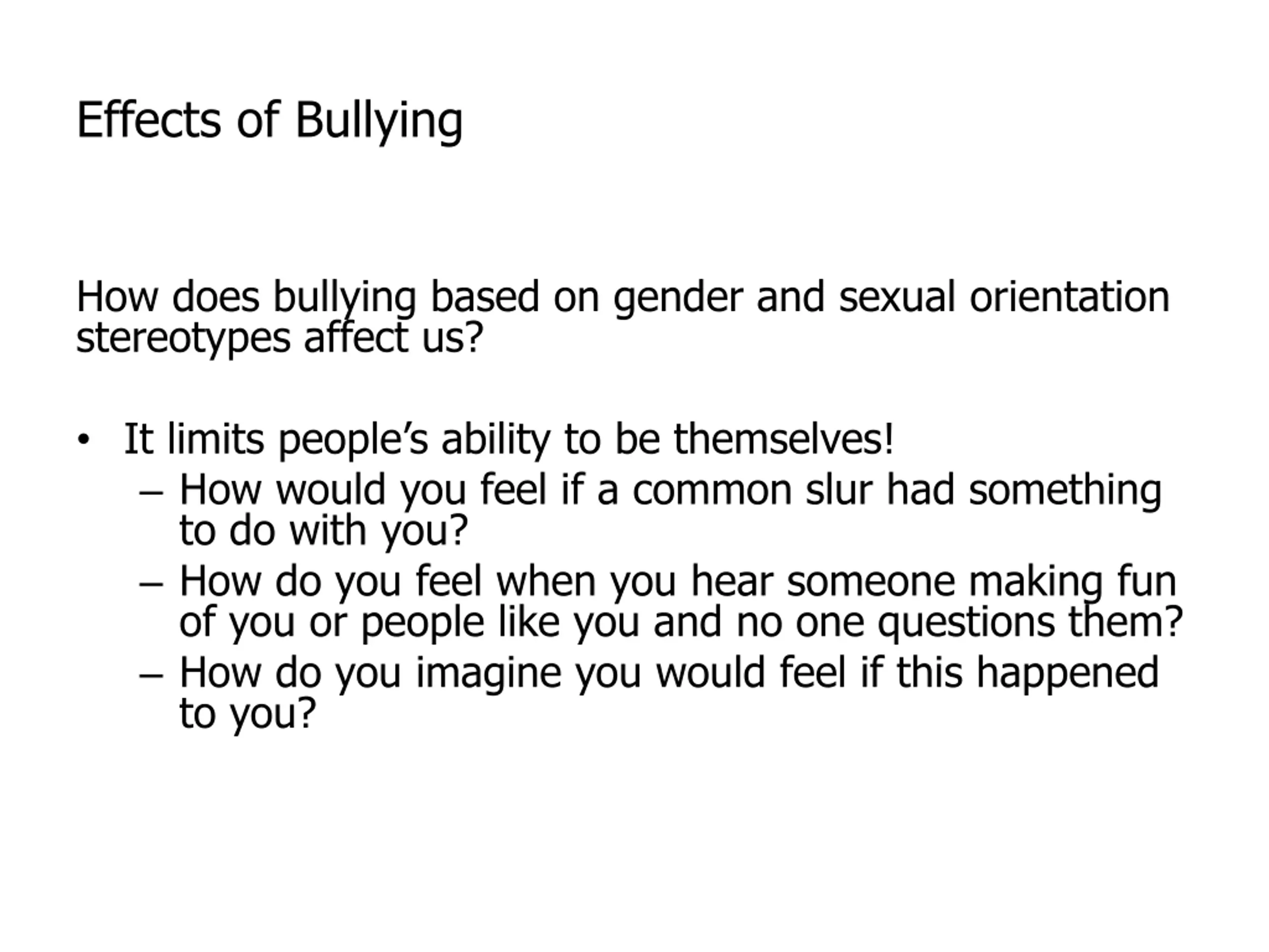 Effects of Bullying How does bullying based on gender and sexual orientation stereotypes affect us? It limits people s ability to be themselves! How would you feel if a common slur had something to do with you? How do you feel when you hear someone making fun of you or people like you and no one questions them? How do you imagine you would feel if this happened to you?