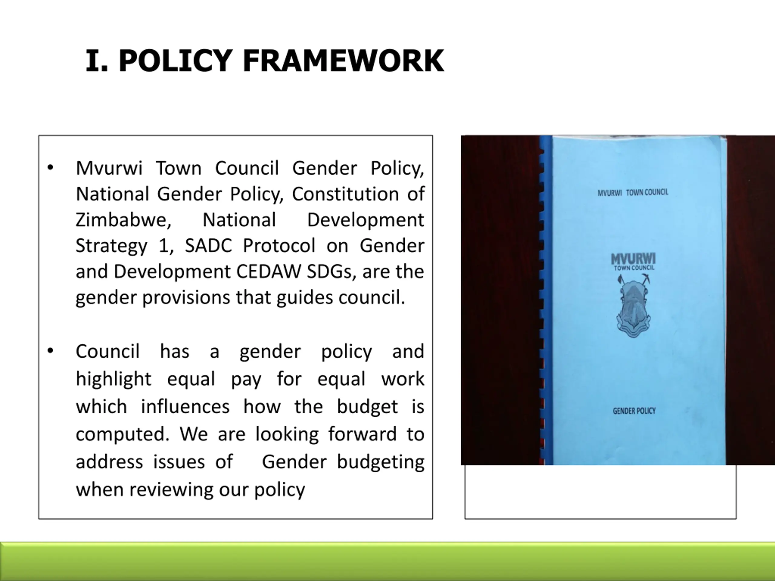 I. POLICY FRAMEWORK Photo of the Gender Policy Mvurwi Town Council Gender Policy, National Gender Policy, Constitution of Zimbabwe, National Strategy 1, SADC Protocol on Gender and Development CEDAW SDGs, are the gender provisions that guides council. Development Council has a gender policy and highlight equal pay for equal work which influences how the budget is computed. We are looking forward to address issues of Gender budgeting when reviewing our policy