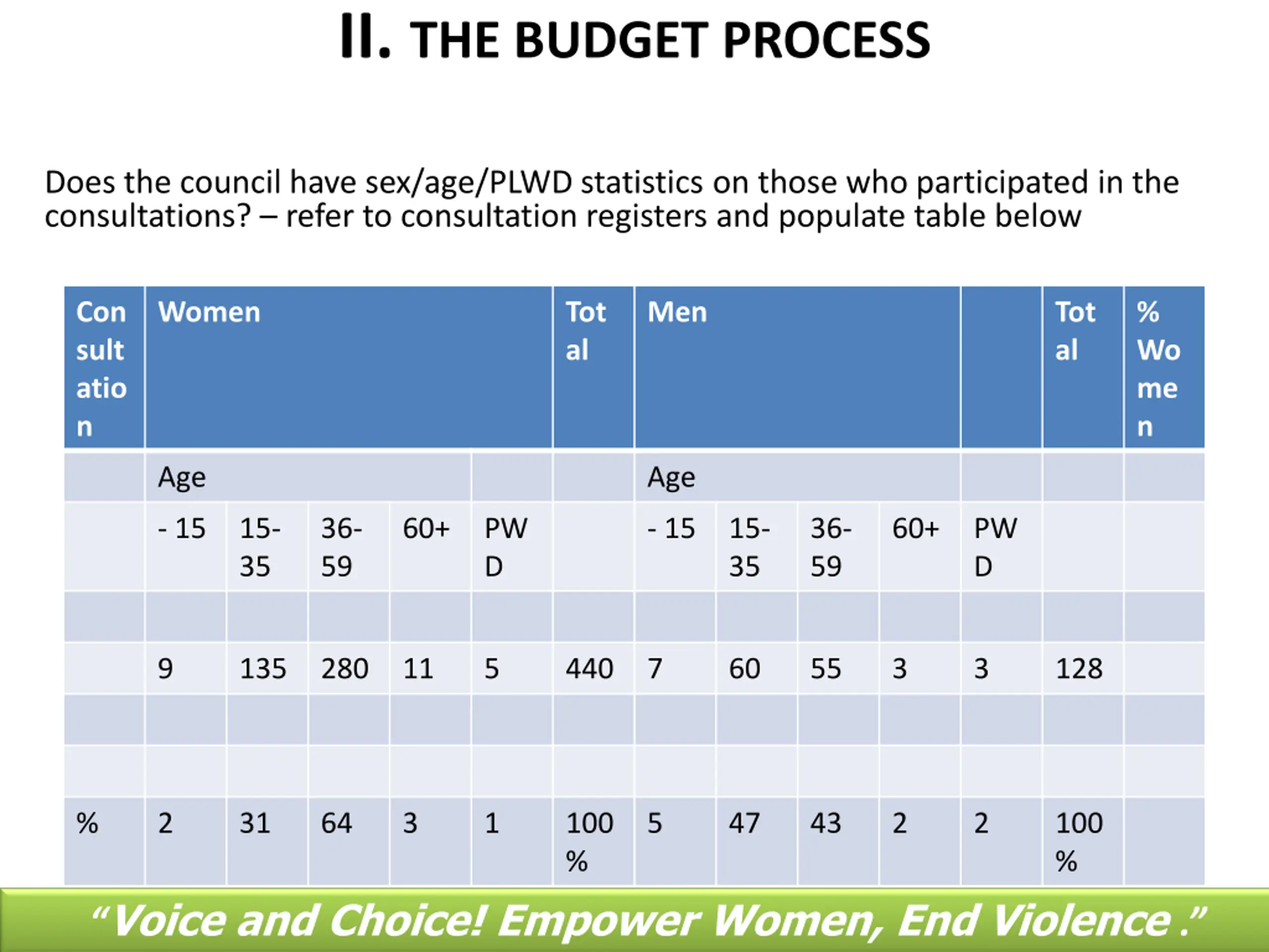 II. THE BUDGET PROCESS Does the council have sex/age/PLWD statistics on those who participated in the consultations? refer to consultation registers and populate table below Con sult atio n Women Tot al Men Tot al % Wo me n Age Age - 15 15- 35 36- 59 60+ PW D - 15 15- 35 36- 59 60+ PW D 9 135 280 11 5 440 7 60 55 3 3 128 % 2 31 64 3 1 100 % 5 47 43 2 2 100 % Voice and Choice! Empower Women, End Violence .