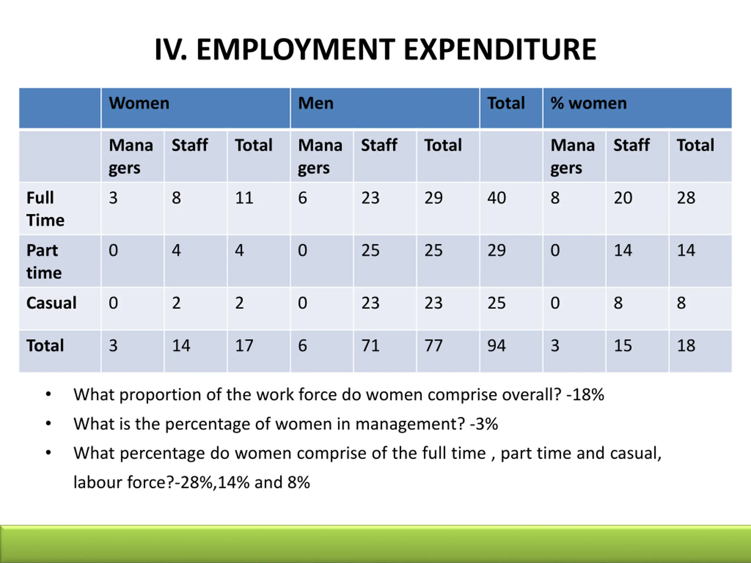 IV. EMPLOYMENT EXPENDITURE Women Men Total % women Mana gers Staff Total Mana gers Staff Total Mana gers Staff Total Full Time 3 8 11 6 23 29 40 8 20 28 Part time 0 4 4 0 25 25 29 0 14 14 Casual 0 2 2 0 23 23 25 0 8 8 Total 3 14 17 6 71 77 94 3 15 18 What proportion of the work force do women comprise overall? -18% What is the percentage of women in management? -3% What percentage do women comprise of the full time , part time and casual, labour force?-28%,14% and 8%