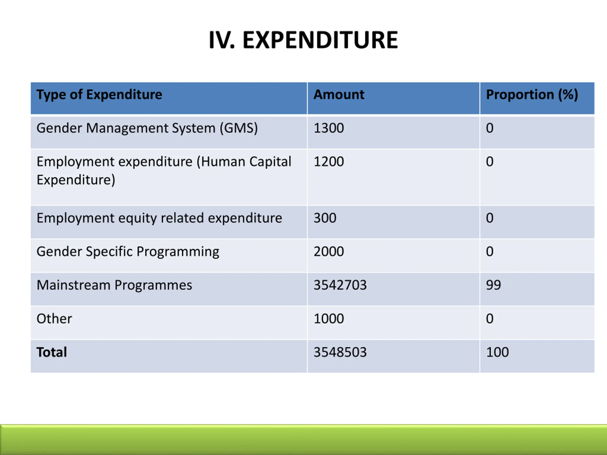 IV. EXPENDITURE Type of Expenditure Amount Proportion (%) Gender Management System (GMS) 1300 0 Employment expenditure (Human Capital Expenditure) 1200 0 Employment equity related expenditure 300 0 Gender Specific Programming 2000 0 Mainstream Programmes 3542703 99 Other 1000 0 Total 3548503 100