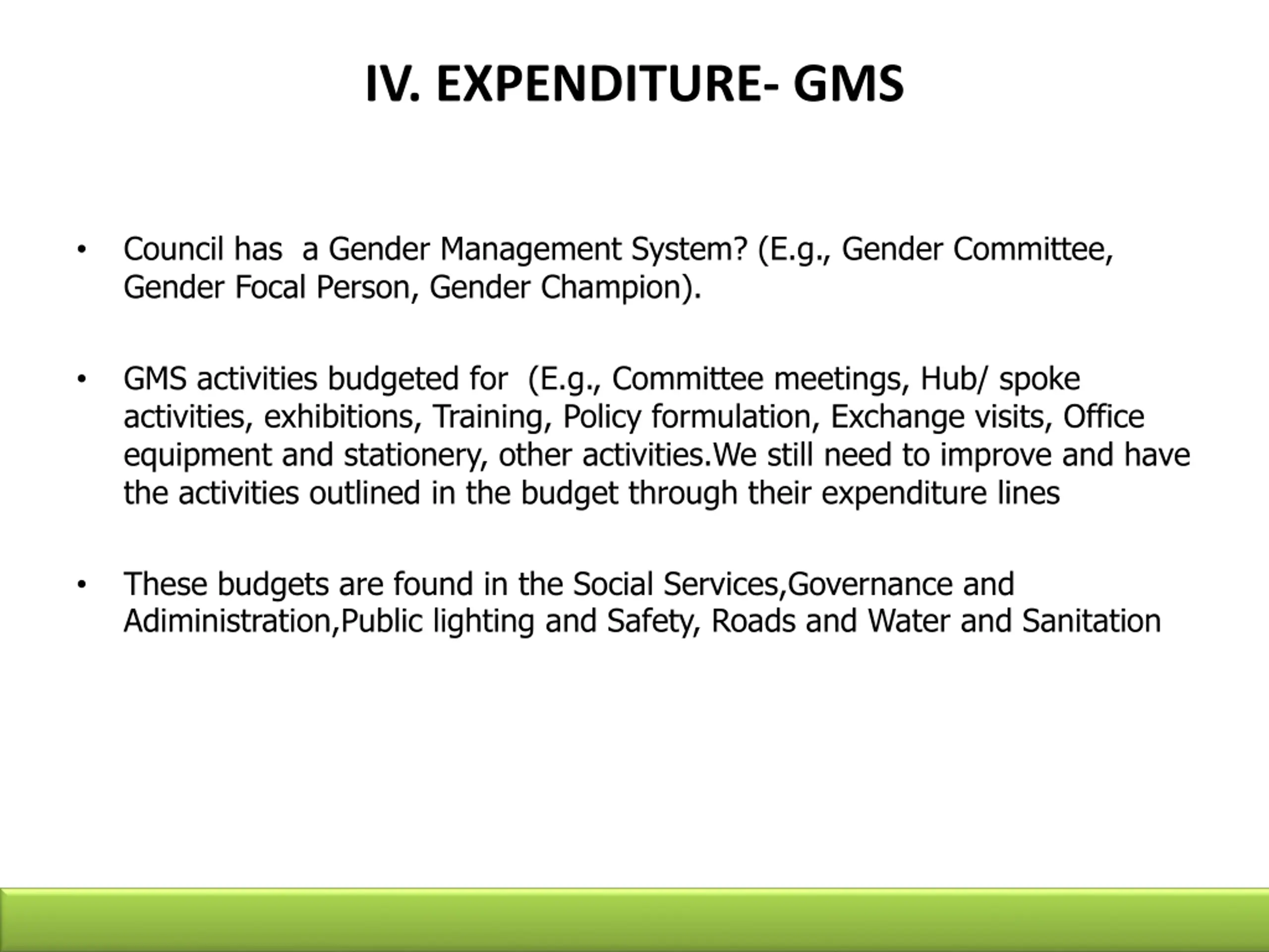 IV. EXPENDITURE- GMS Council has a Gender Management System? (E.g., Gender Committee, Gender Focal Person, Gender Champion). GMS activities budgeted for (E.g., Committee meetings, Hub/ spoke activities, exhibitions, Training, Policy formulation, Exchange visits, Office equipment and stationery, other activities.We still need to improve and have the activities outlined in the budget through their expenditure lines These budgets are found in the Social Services,Governance and Adiministration,Public lighting and Safety, Roads and Water and Sanitation
