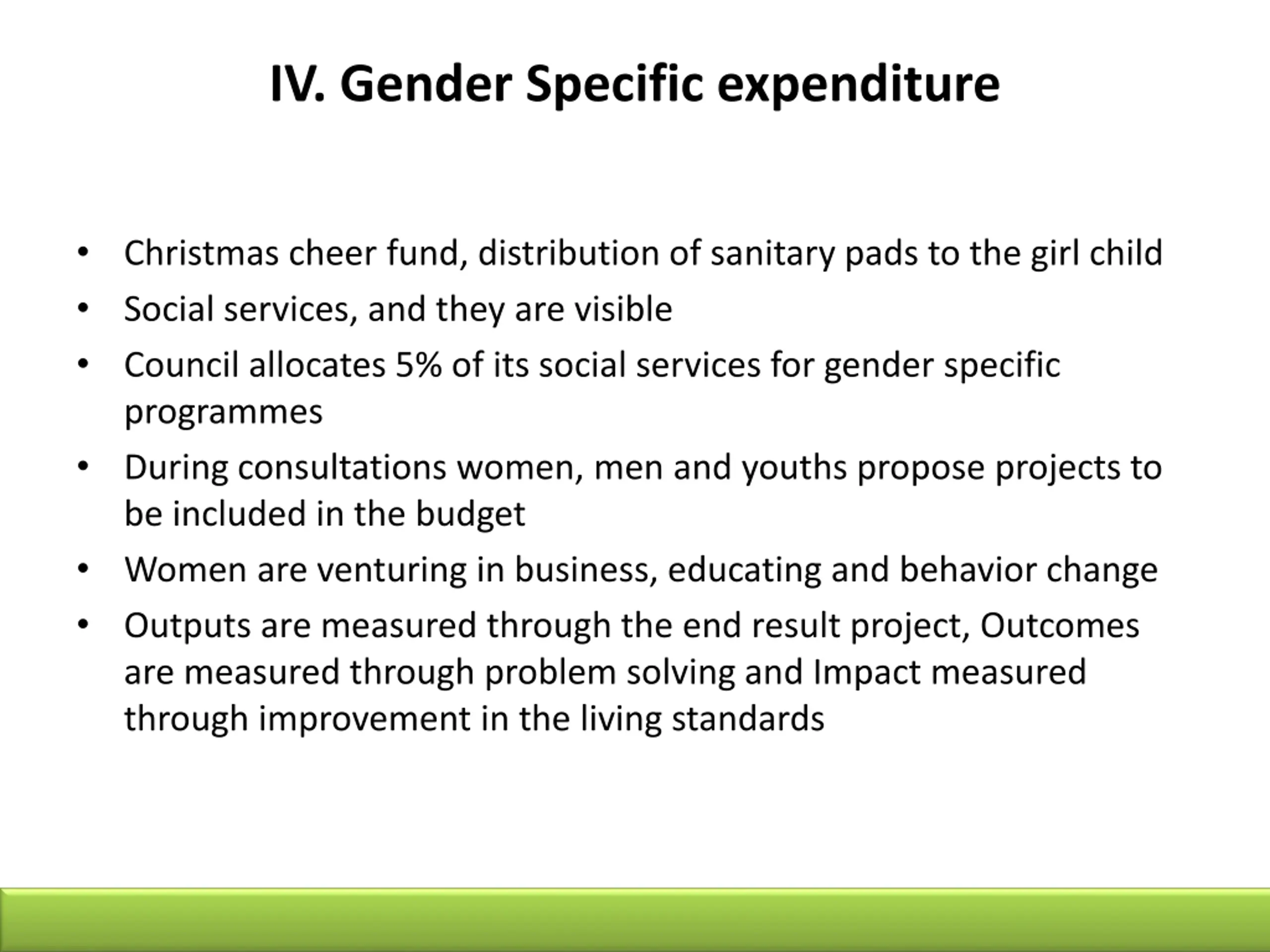 IV. Gender Specific expenditure Christmas cheer fund, distribution of sanitary pads to the girl child Social services, and they are visible Council allocates 5% of its social services for gender specific programmes During consultations women, men and youths propose projects to be included in the budget Women are venturing in business, educating and behavior change Outputs are measured through the end result project, Outcomes are measured through problem solving and Impact measured through improvement in the living standards