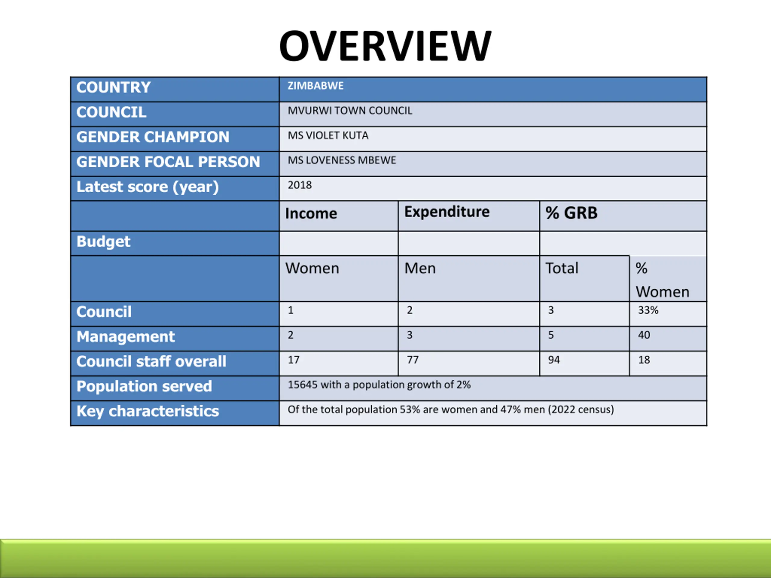 OVERVIEW COUNTRY COUNCIL GENDER CHAMPION GENDER FOCAL PERSON Latest score (year) ZIMBABWE MVURWI TOWN COUNCIL MS VIOLET KUTA MS LOVENESS MBEWE 2018 Expenditure % GRB Income Budget Women Men Total % Women 33% Council Management Council staff overall Population served Key characteristics 1 2 3 2 3 5 40 17 77 94 18 15645 with a population growth of 2% Of the total population 53% are women and 47% men (2022 census)