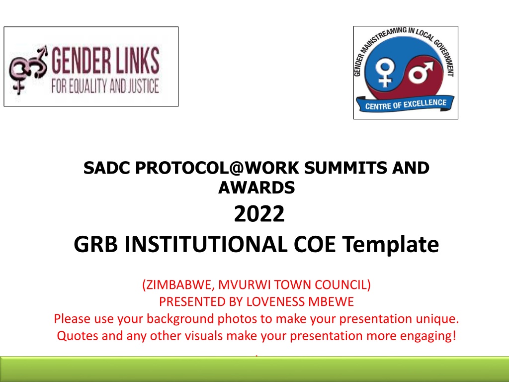 SADC PROTOCOL@WORK SUMMITS AND AWARDS 2022 GRB INSTITUTIONAL COE Template (ZIMBABWE, MVURWI TOWN COUNCIL) PRESENTED BY LOVENESS MBEWE Please use your background photos to make your presentation unique. Quotes and any other visuals make your presentation more engaging! .
