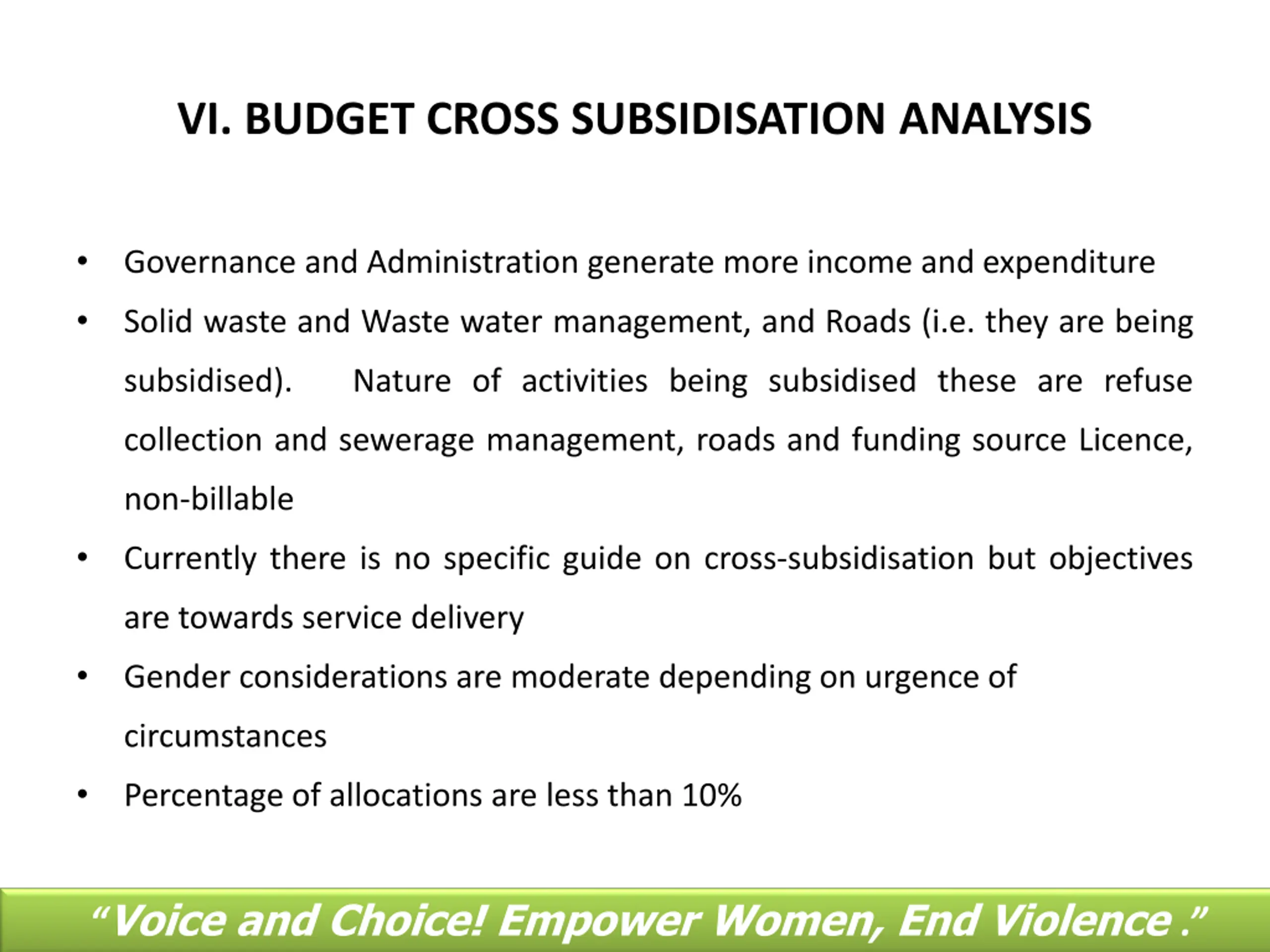 VI. BUDGET CROSS SUBSIDISATION ANALYSIS Governance and Administration generate more income and expenditure Solid waste and Waste water management, and Roads (i.e. they are being subsidised). Nature of activities being subsidised these are refuse collection and sewerage management, roads and funding source Licence, non-billable Currently there is no specific guide on cross-subsidisation but objectives are towards service delivery Gender considerations are moderate depending on urgence of circumstances Percentage of allocations are less than 10% Voice and Choice! Empower Women, End Violence .