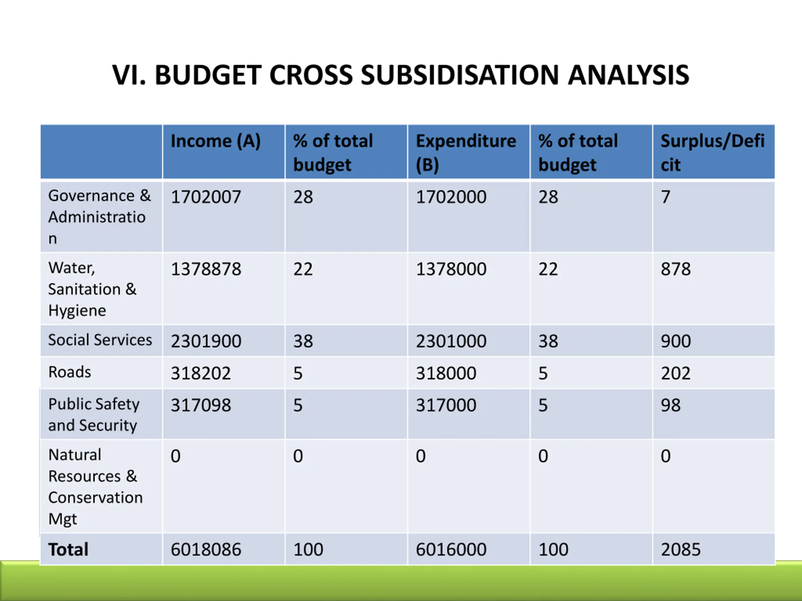 VI. BUDGET CROSS SUBSIDISATION ANALYSIS Income (A) % of total budget Expenditure (B) % of total budget Surplus/Defi cit Governance & Administratio n 1702007 28 1702000 28 7 Water, Sanitation & Hygiene 1378878 22 1378000 22 878 Social Services 2301900 38 2301000 38 900 Roads 318202 5 318000 5 202 Public Safety and Security 317098 5 317000 5 98 Natural Resources & Conservation Mgt 0 0 0 0 0 Total 6018086 100 6016000 100 2085
