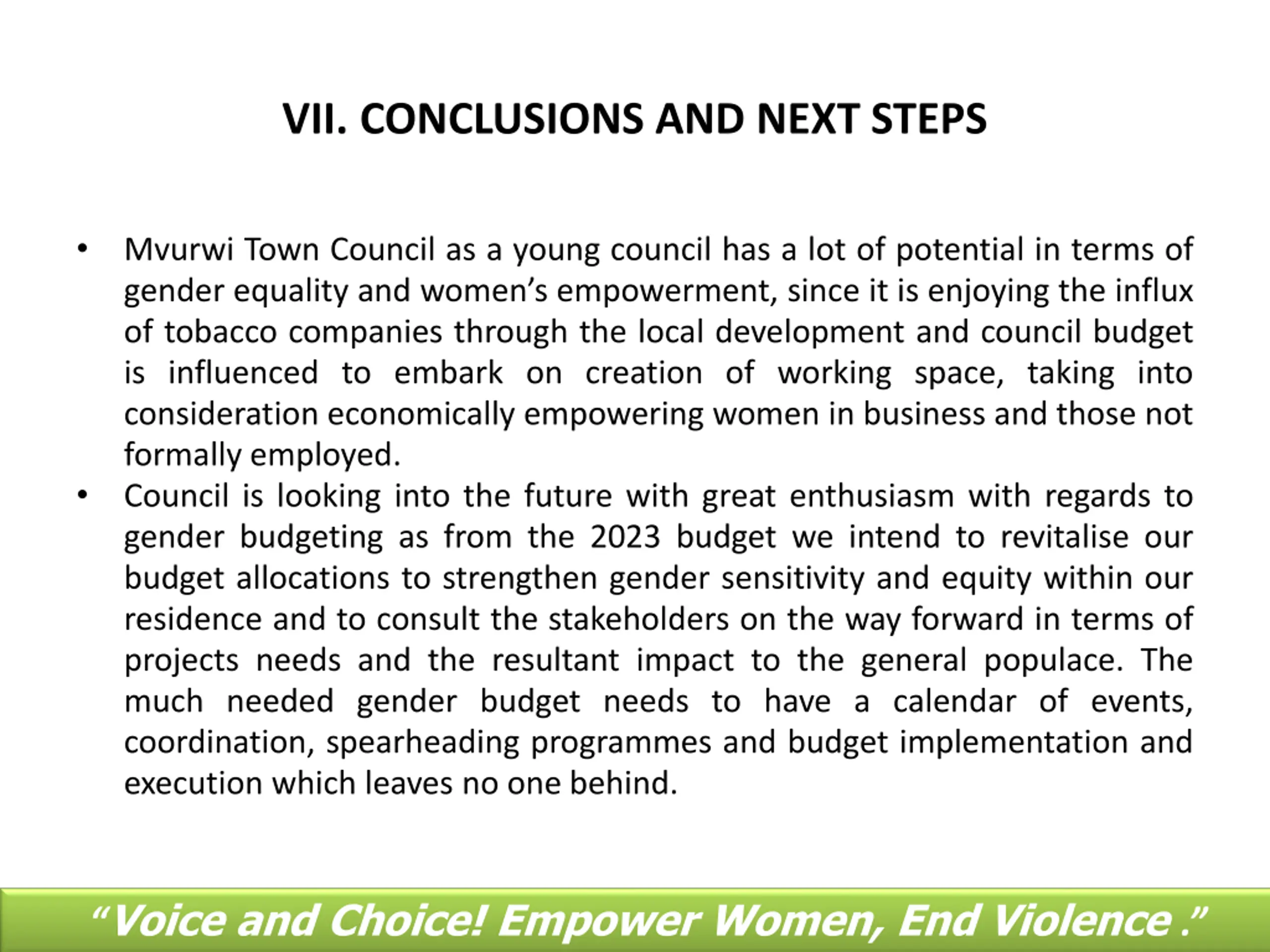 VII. CONCLUSIONS AND NEXT STEPS Mvurwi Town Council as a young council has a lot of potential in terms of gender equality and women s empowerment, since it is enjoying the influx of tobacco companies through the local development and council budget is influenced to embark on creation of working space, taking into consideration economically empowering women in business and those not formally employed. Council is looking into the future with great enthusiasm with regards to gender budgeting as from the 2023 budget we intend to revitalise our budget allocations to strengthen gender sensitivity and equity within our residence and to consult the stakeholders on the way forward in terms of projects needs and the resultant impact to the general populace. The much needed gender budget needs to have a calendar of events, coordination, spearheading programmes and budget implementation and execution which leaves no one behind. Voice and Choice! Empower Women, End Violence .