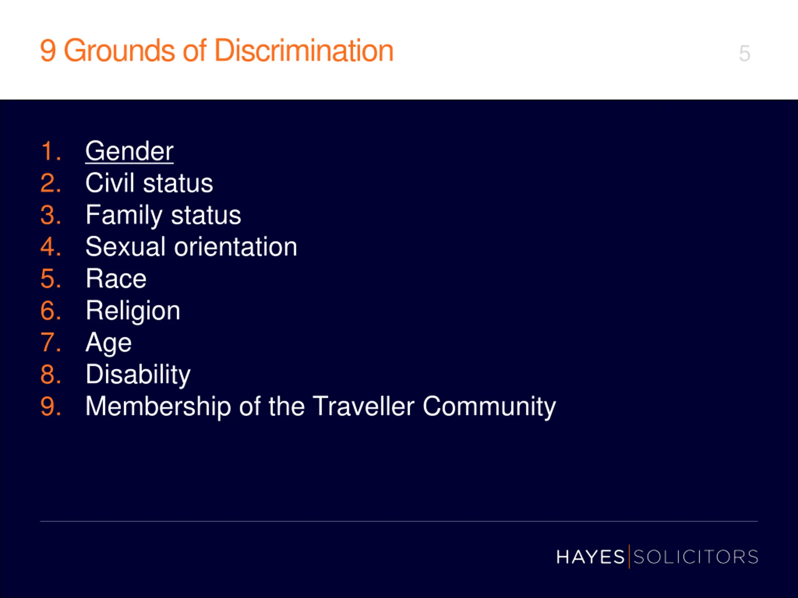 Irish Employment Equality Law 4 The Acts prohibits employers from: Discriminating Harassing; or Victimising prospective or current employees on nine grounds (including gender)