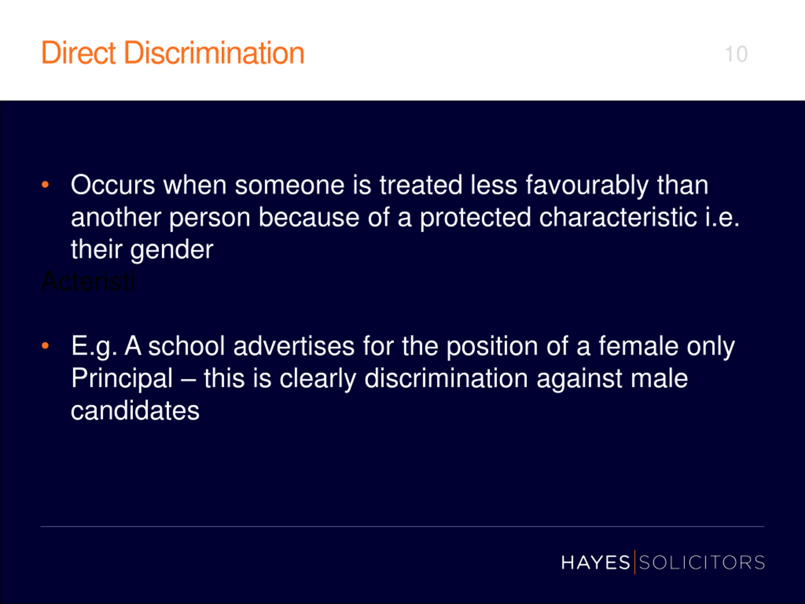 Direct Discrimination 10 Occurs when someone is treated less favourably than another person because of a protected characteristic i.e. their gender Acteristi E.g. A school advertises for the position of a female only Principal this is clearly discrimination against male candidates