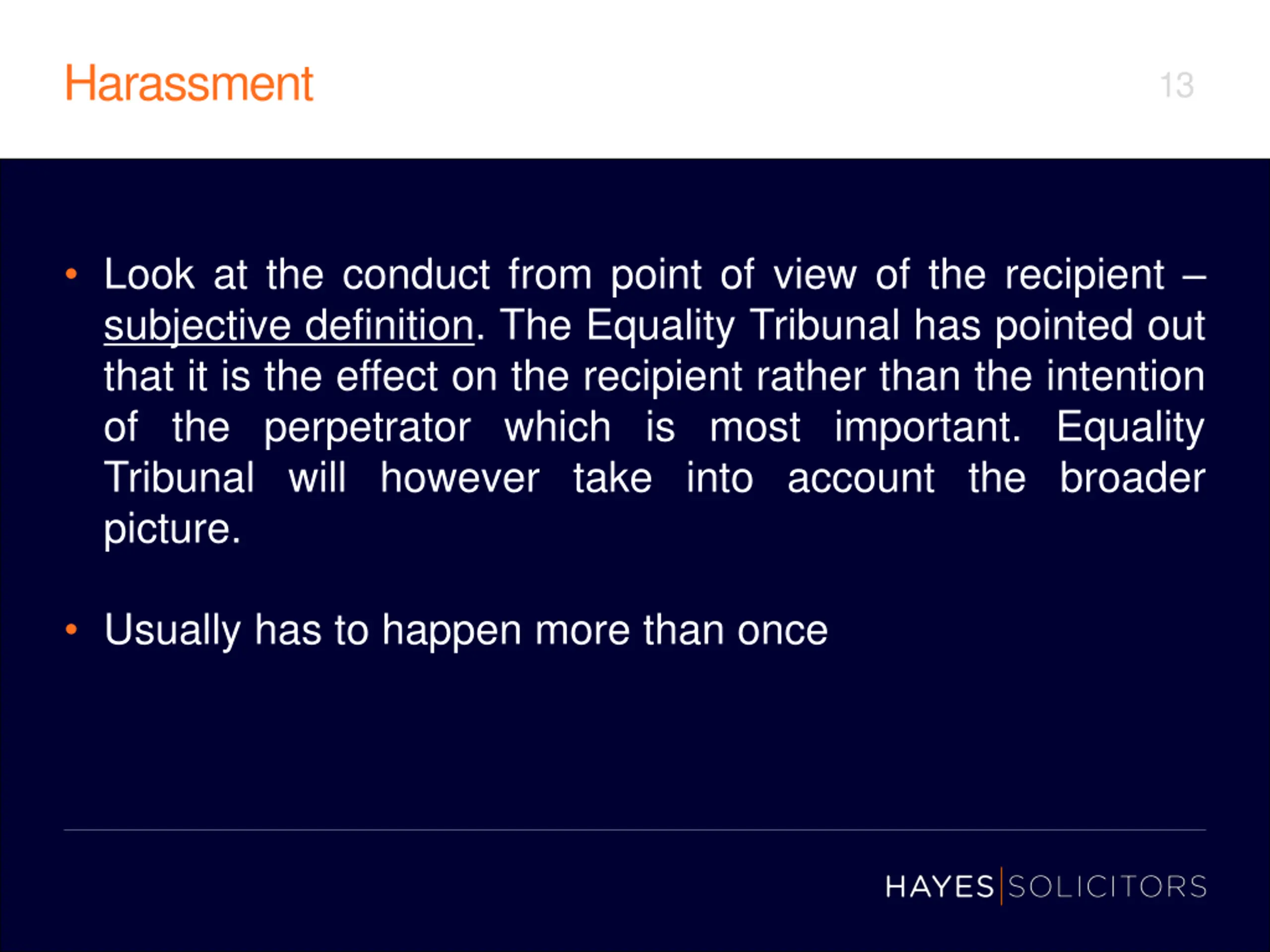 Harassment 13 Look at the conduct from point of view of the recipient subjective definition. The Equality Tribunal has pointed out that it is the effect on the recipient rather than the intention of the perpetrator which is most important. Equality Tribunal will however take into account the broader picture. Usually has to happen more than once