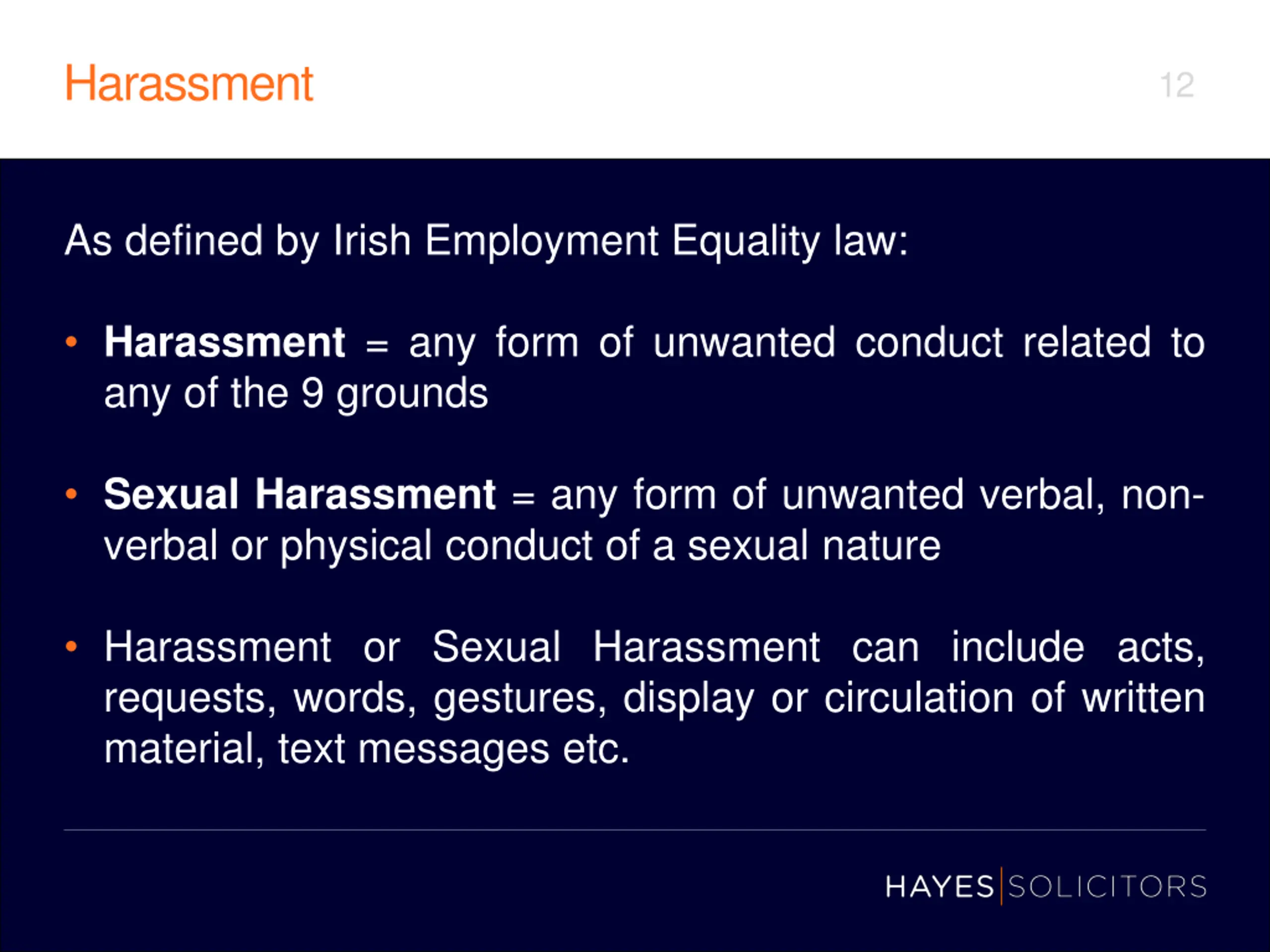 Harassment 12 As defined by Irish Employment Equality law: Harassment = any form of unwanted conduct related to any of the 9 grounds Sexual Harassment = any form of unwanted verbal, non- verbal or physical conduct of a sexual nature Harassment or Sexual Harassment can include acts, requests, words, gestures, display or circulation of written material, text messages etc.