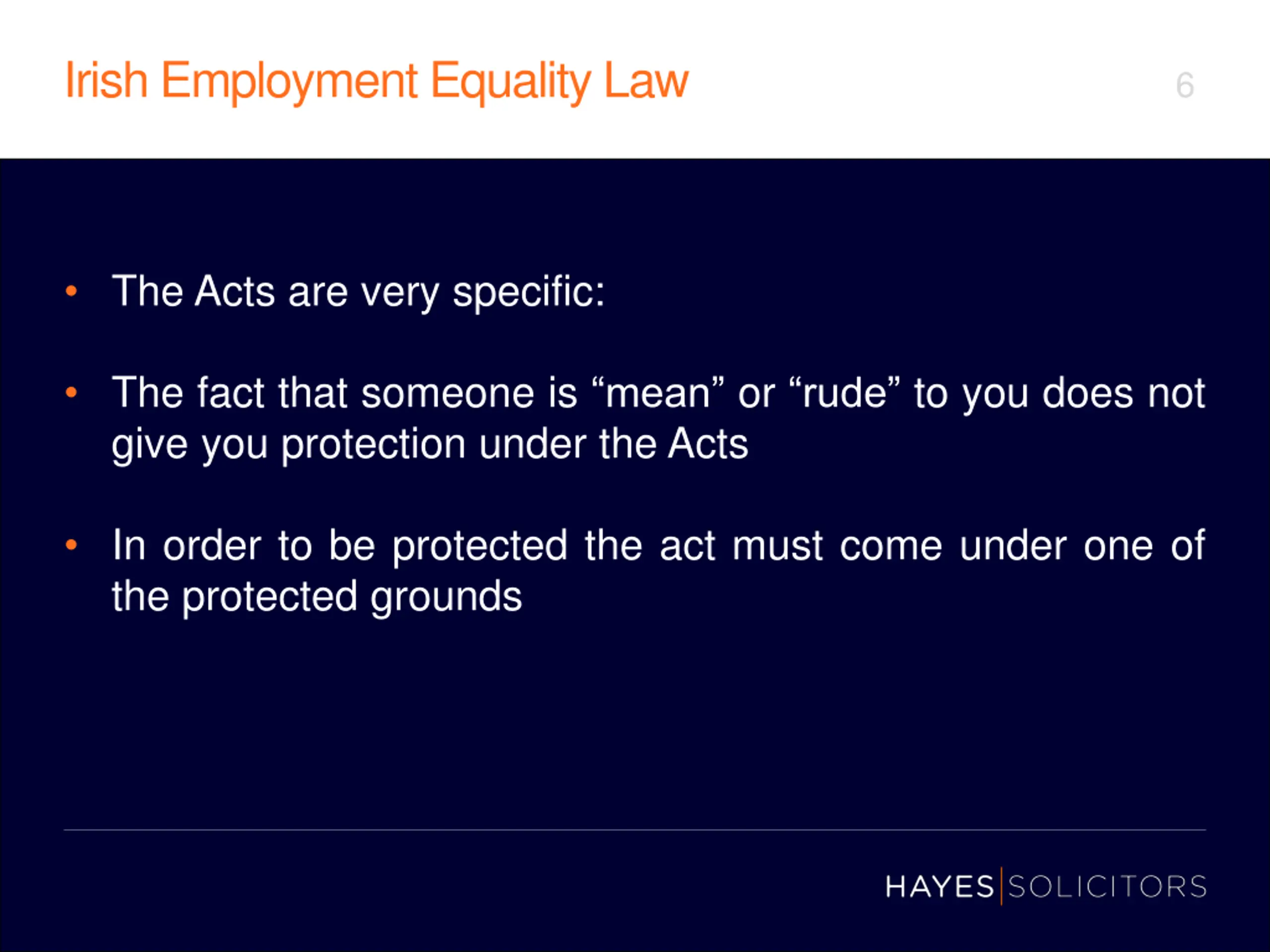 Irish Employment Equality Law 6 The Acts are very specific: The fact that someone is mean or rude to you does not give you protection under the Acts In order to be protected the act must come under one of the protected grounds