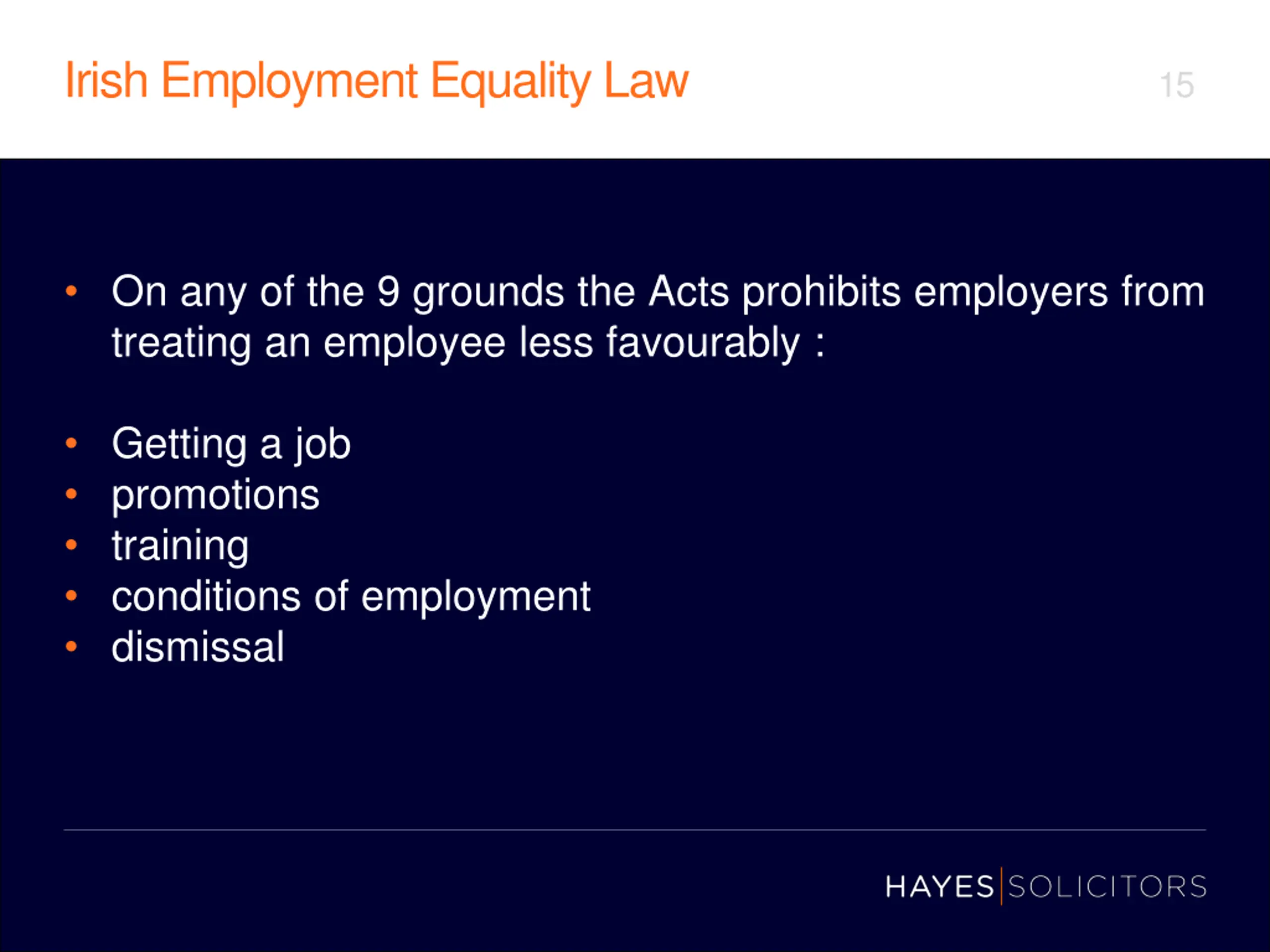 Irish Employment Equality Law 15 On any of the 9 grounds the Acts prohibits employers from treating an employee less favourably : Getting a job promotions training conditions of employment dismissal