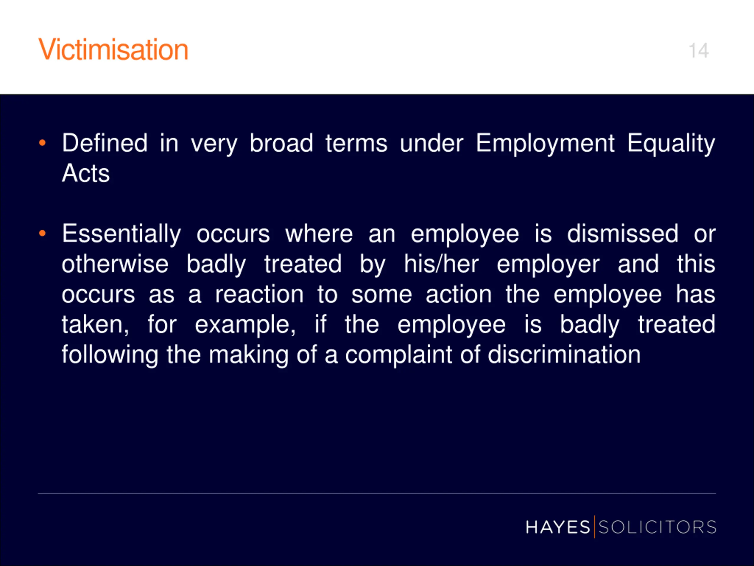 Victimisation 14 Defined in very broad terms under Employment Equality Acts Essentially occurs where an employee is dismissed or otherwise badly treated by his/her employer and this occurs as a reaction to some action the employee has taken, for example, if the employee is badly treated following the making of a complaint of discrimination