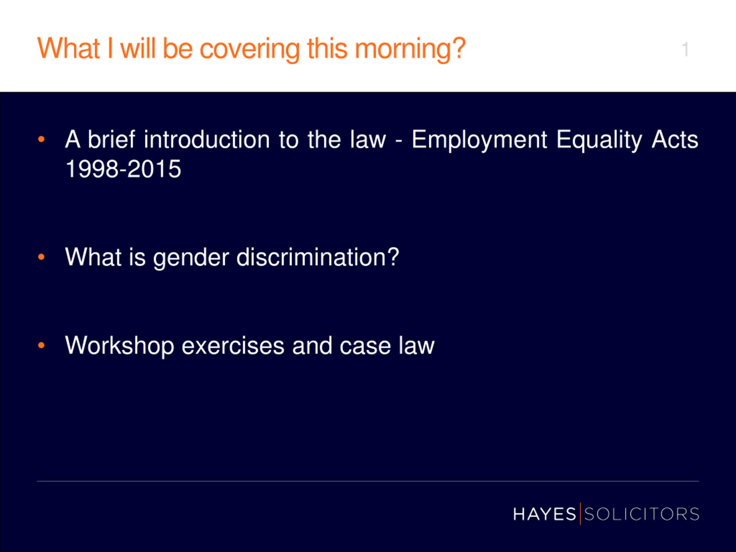 What I will be covering this morning? 1 A brief introduction to the law - Employment Equality Acts 1998-2015 What is gender discrimination? Workshop exercises and case law