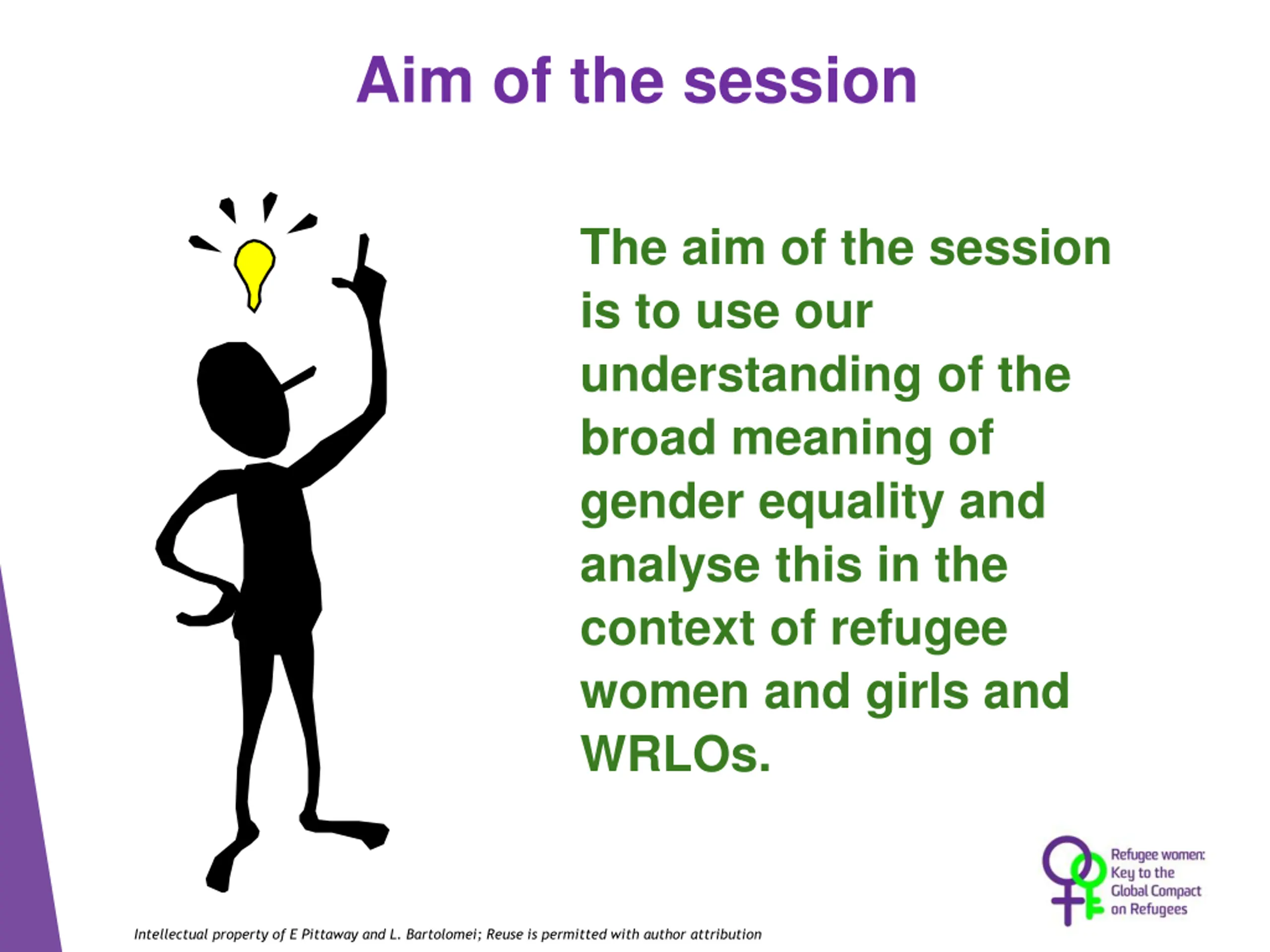 Aim of the session The aim of the session is to use our understanding of the broad meaning of gender equality and analyse this in the context of refugee women and girls and WRLOs. Intellectual property of E Pittaway and L. Bartolomei; Reuse is permitted with author attribution