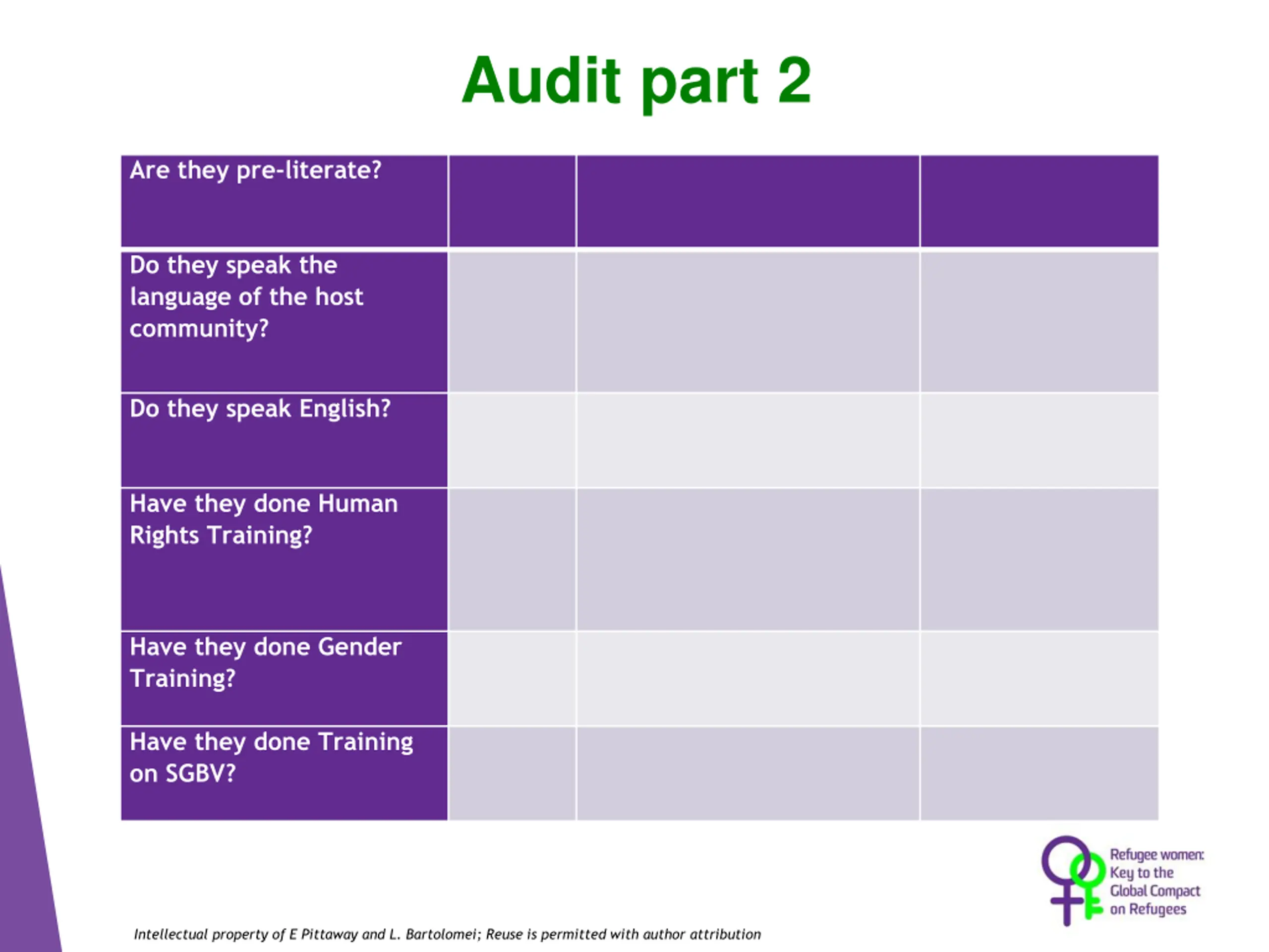 Audit part 2 Are they pre-literate? Do they speak the language of the host community? Do they speak English? Have they done Human Rights Training? Have they done Gender Training? Have they done Training on SGBV? Intellectual property of E Pittaway and L. Bartolomei; Reuse is permitted with author attribution