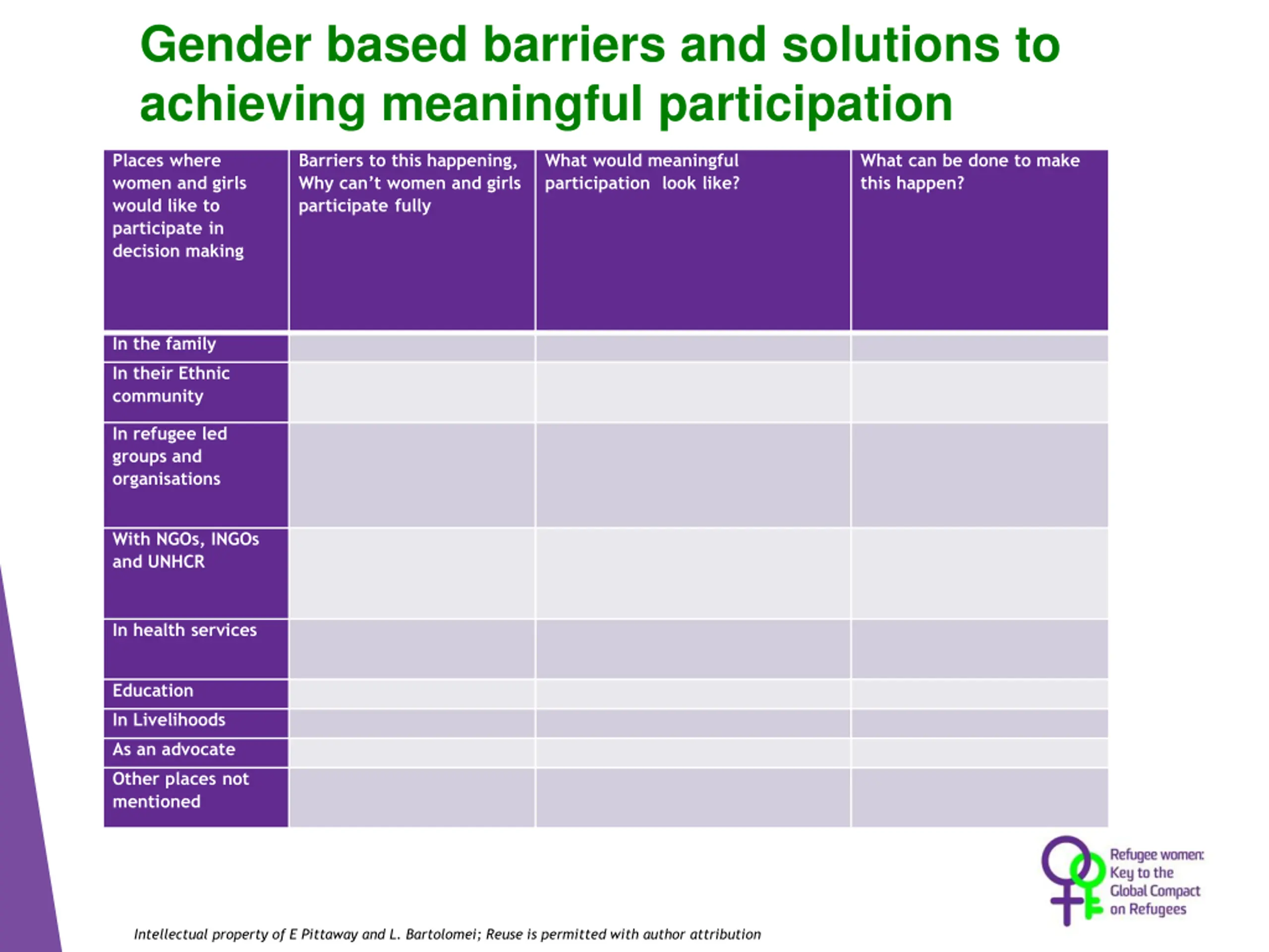 Gender based barriers and solutions to achieving meaningful participation Places where women and girls would like to participate in decision making Barriers to this happening, Why can t women and girls participate fully What would meaningful participation look like? What can be done to make this happen? In the family In their Ethnic community In refugee led groups and organisations With NGOs, INGOs and UNHCR In health services Education In Livelihoods As an advocate Other places not mentioned Intellectual property of E Pittaway and L. Bartolomei; Reuse is permitted with author attribution