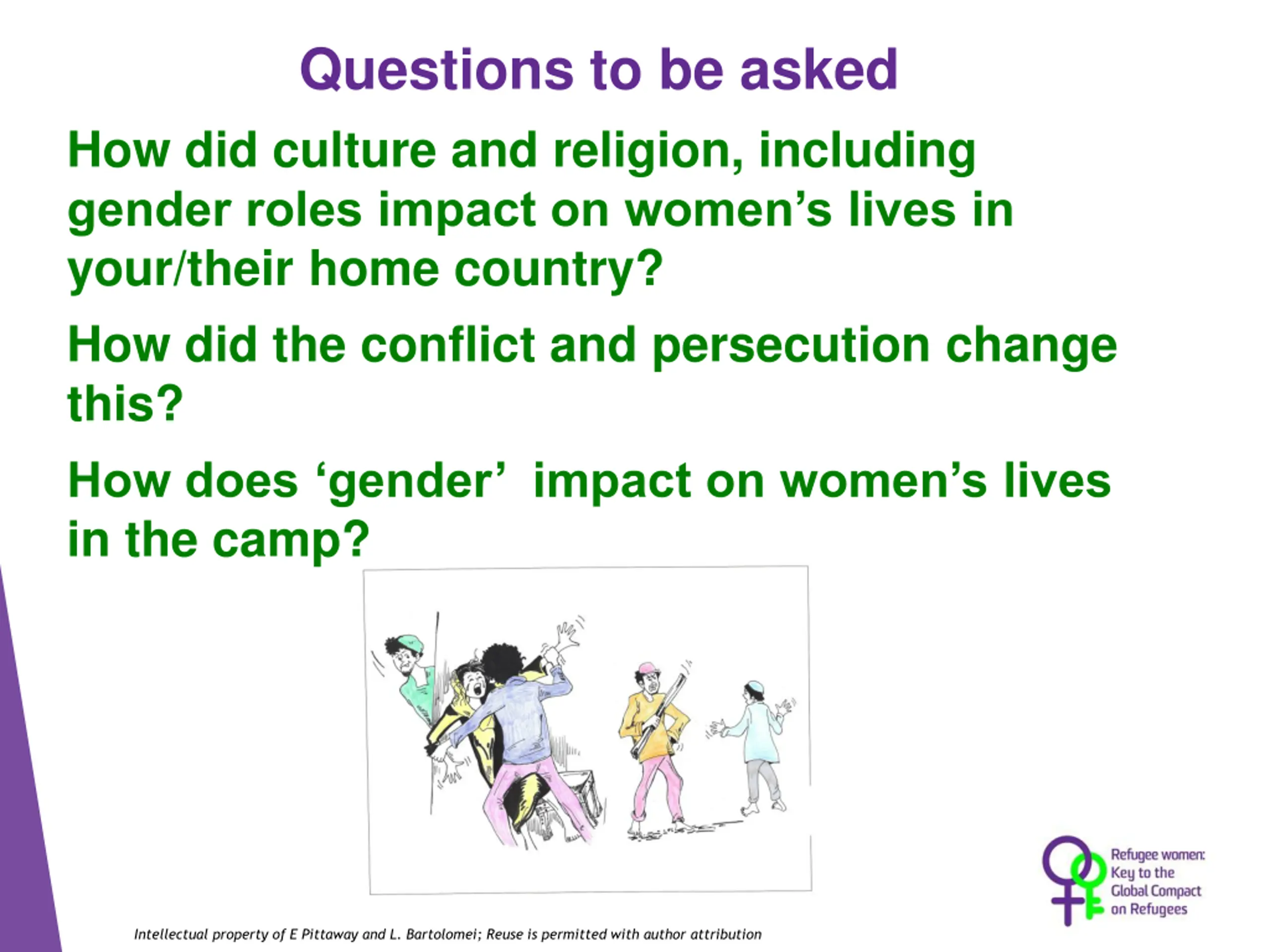 Questions to be asked How did culture and religion, including gender roles impact on women s lives in your/their home country? How did the conflict and persecution change this? How does gender impact on women s lives in the camp? Intellectual property of E Pittaway and L. Bartolomei; Reuse is permitted with author attribution