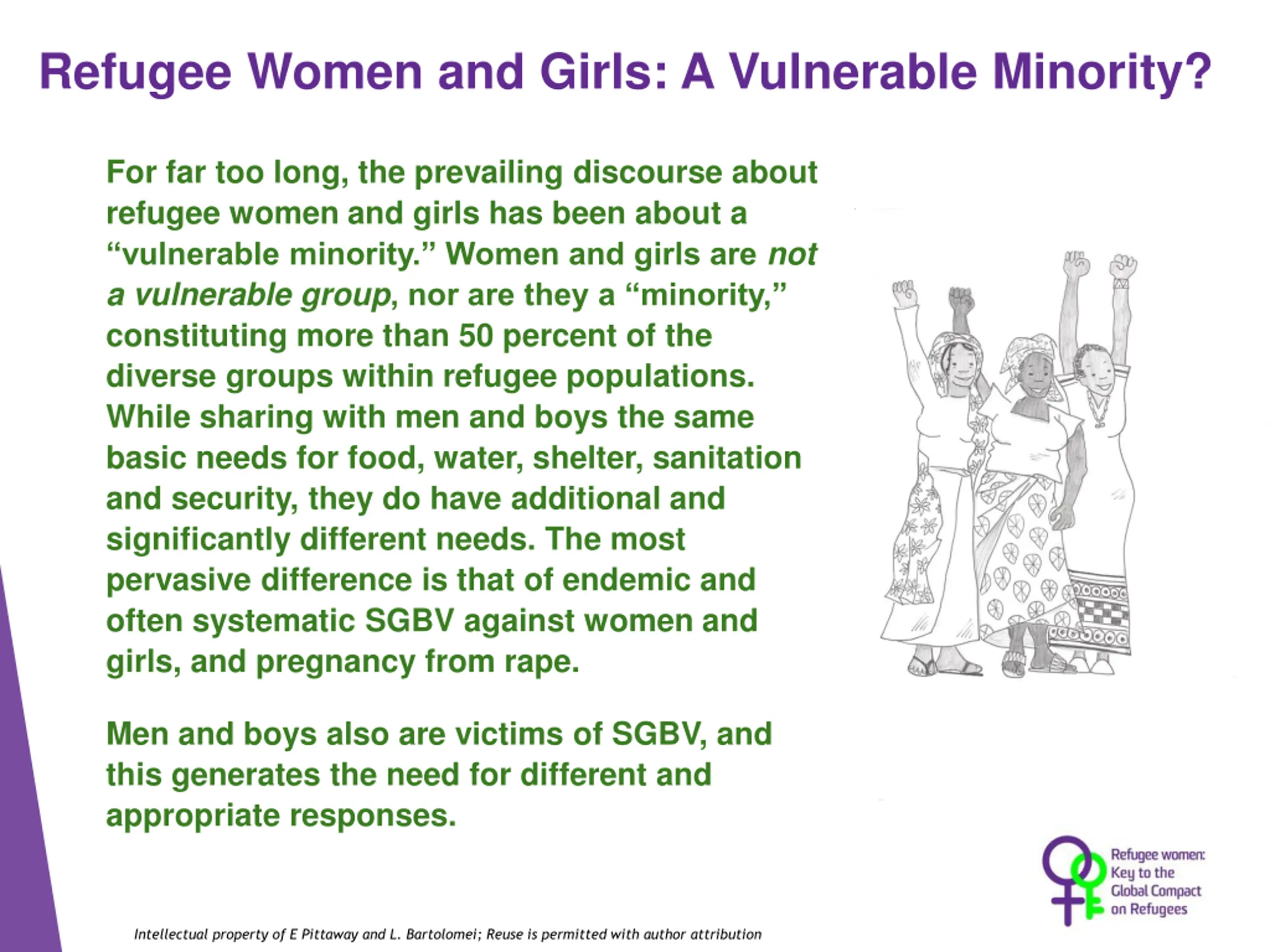 Refugee Women and Girls: A Vulnerable Minority? For far too long, the prevailing discourse about refugee women and girls has been about a vulnerable minority. Women and girls are not a vulnerable group, nor are they a minority, constituting more than 50 percent of the diverse groups within refugee populations. While sharing with men and boys the same basic needs for food, water, shelter, sanitation and security, they do have additional and significantly different needs. The most pervasive difference is that of endemic and often systematic SGBV against women and girls, and pregnancy from rape. Men and boys also are victims of SGBV, and this generates the need for different and appropriate responses. Intellectual property of E Pittaway and L. Bartolomei; Reuse is permitted with author attribution