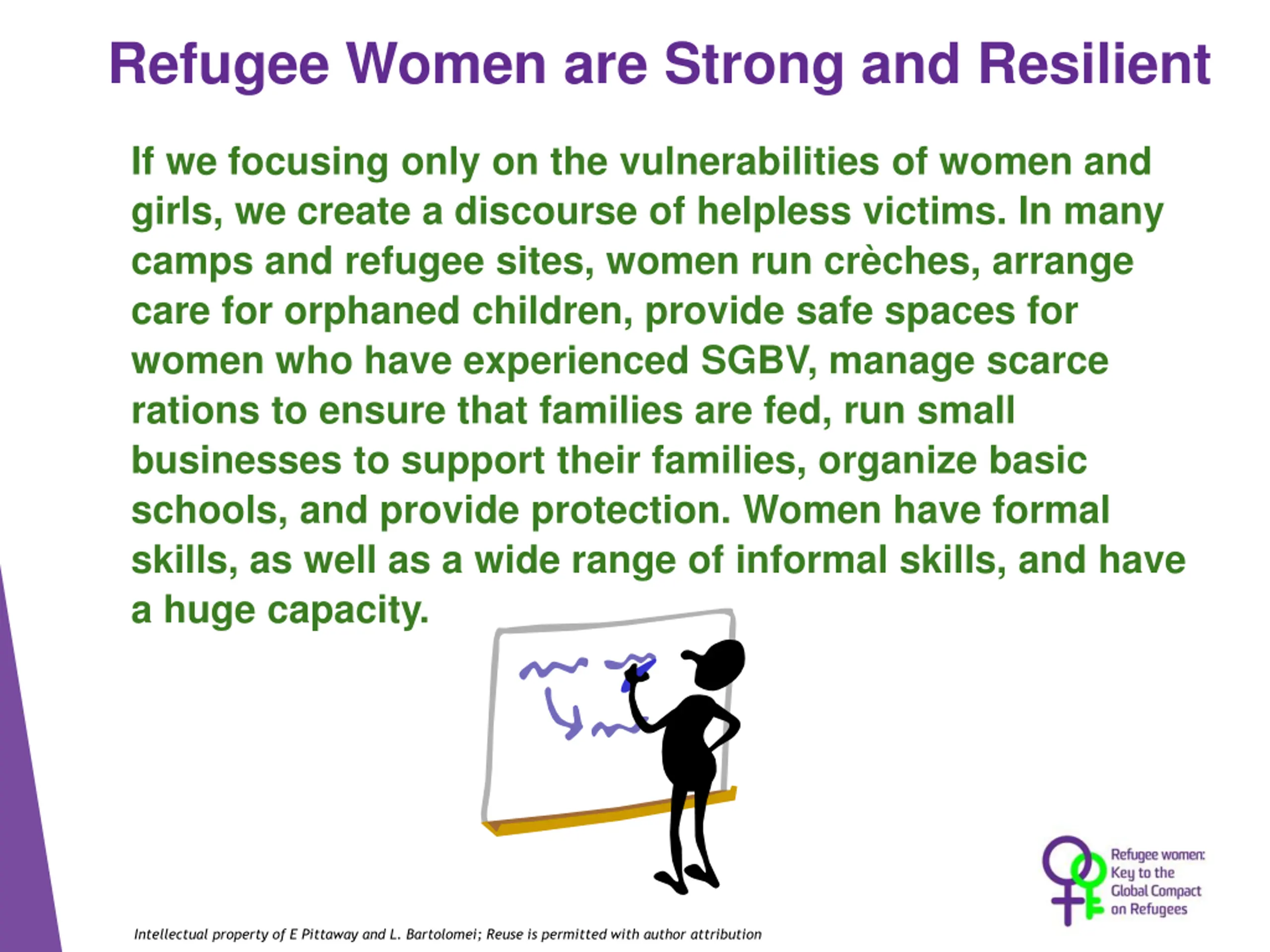 Refugee Women are Strong and Resilient If we focusing only on the vulnerabilities of women and girls, we create a discourse of helpless victims. In many camps and refugee sites, women run cr ches, arrange care for orphaned children, provide safe spaces for women who have experienced SGBV, manage scarce rations to ensure that families are fed, run small businesses to support their families, organize basic schools, and provide protection. Women have formal skills, as well as a wide range of informal skills, and have a huge capacity. Intellectual property of E Pittaway and L. Bartolomei; Reuse is permitted with author attribution