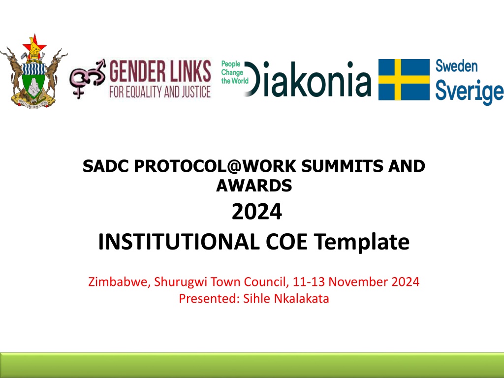 SADC PROTOCOL@WORK SUMMITS AND AWARDS 2024 INSTITUTIONAL COE Template Zimbabwe, Shurugwi Town Council, 11-13 November 2024 Presented: Sihle Nkalakata