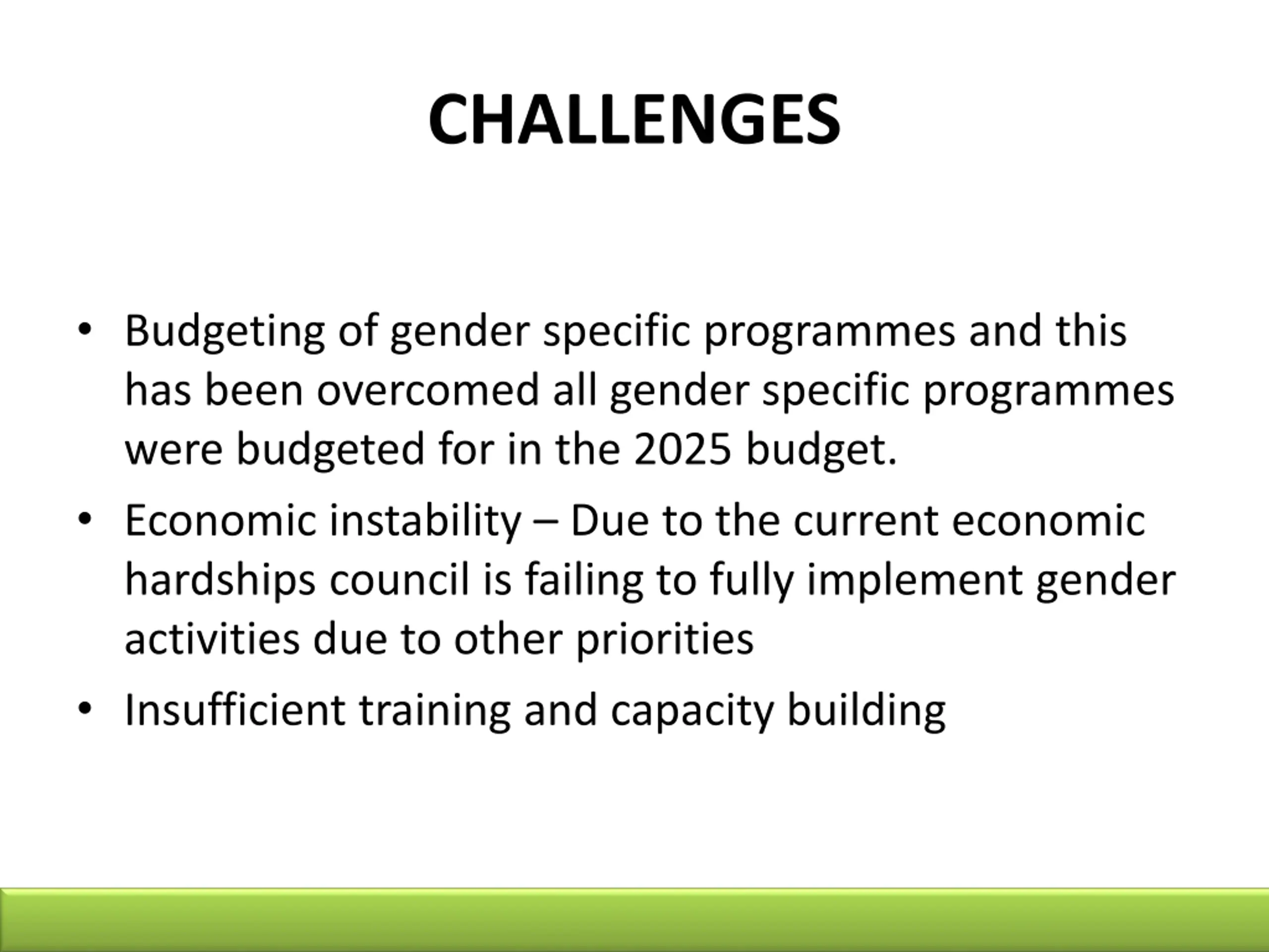 CHALLENGES Budgeting of gender specific programmes and this has been overcomed all gender specific programmes were budgeted for in the 2025 budget. Economic instability Due to the current economic hardships council is failing to fully implement gender activities due to other priorities Insufficient training and capacity building