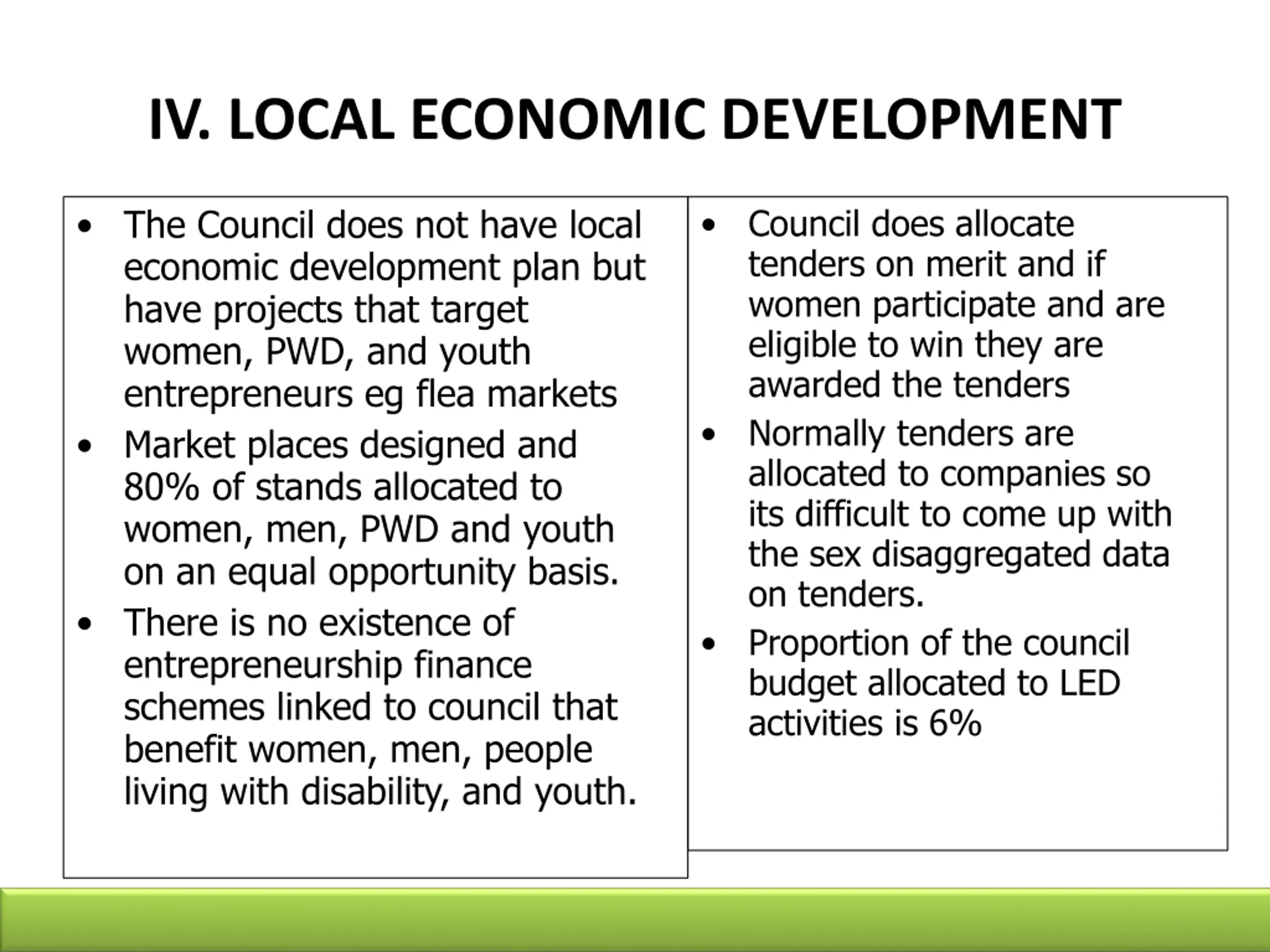 IV. LOCAL ECONOMIC DEVELOPMENT The Council does not have local economic development plan but have projects that target women, PWD, and youth entrepreneurs eg flea markets Market places designed and 80% of stands allocated to women, men, PWD and youth on an equal opportunity basis. There is no existence of entrepreneurship finance schemes linked to council that benefit women, men, people living with disability, and youth. Council does allocate tenders on merit and if women participate and are eligible to win they are awarded the tenders Normally tenders are allocated to companies so its difficult to come up with the sex disaggregated data on tenders. Proportion of the council budget allocated to LED activities is 6%