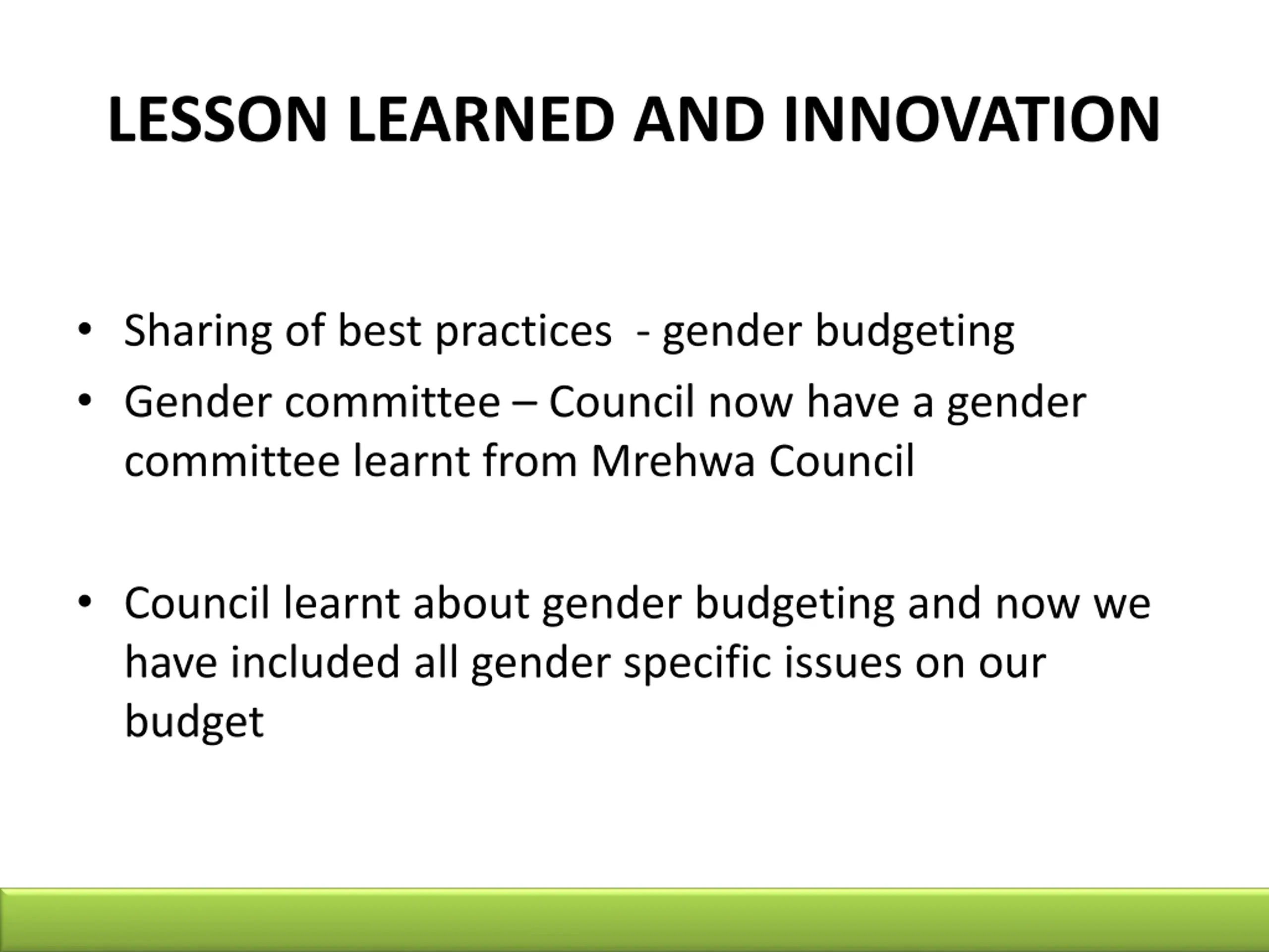 LESSON LEARNED AND INNOVATION Sharing of best practices - gender budgeting Gender committee Council now have a gender committee learnt from Mrehwa Council Council learnt about gender budgeting and now we have included all gender specific issues on our budget