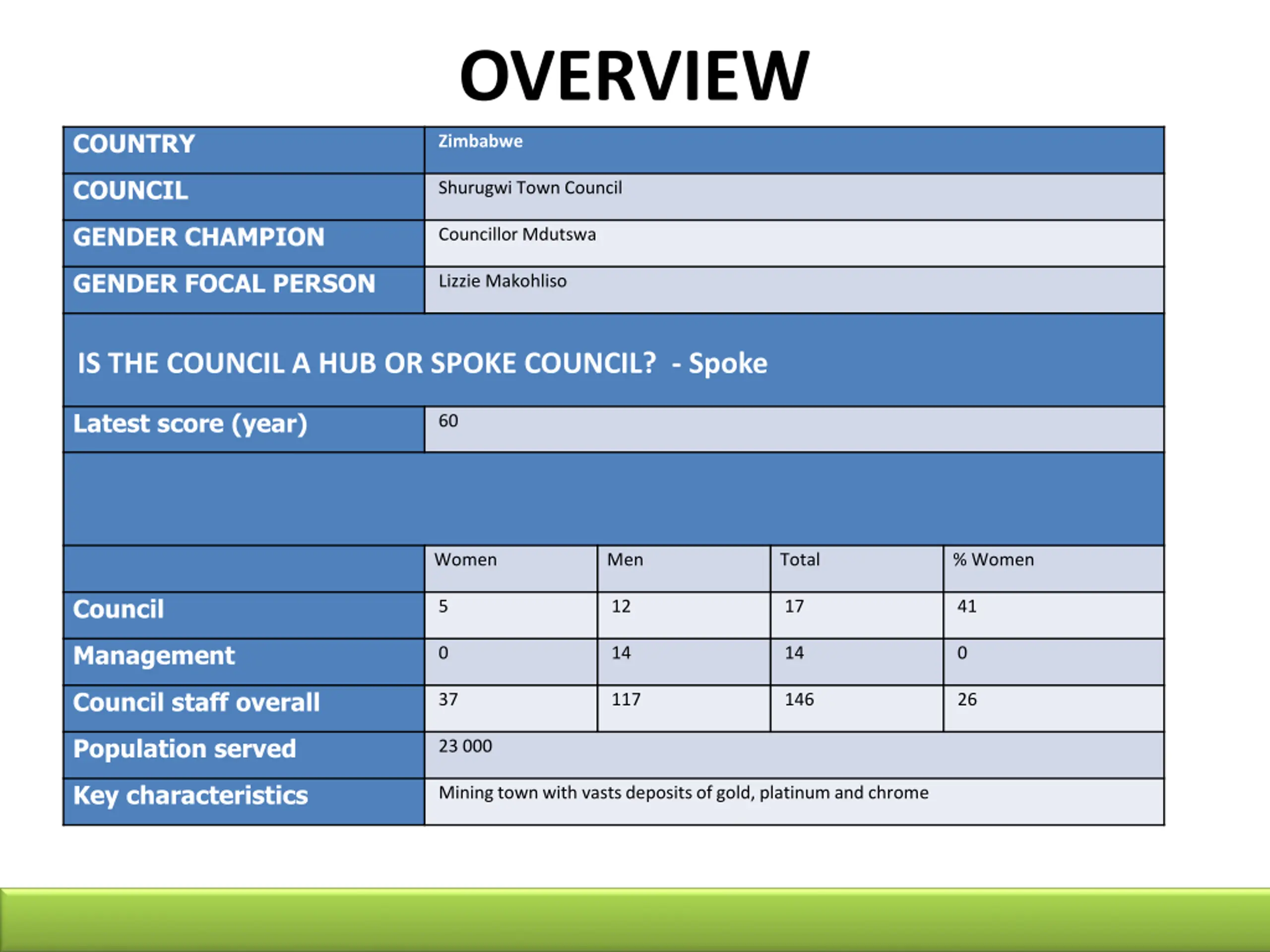 OVERVIEW COUNTRY Zimbabwe COUNCIL Shurugwi Town Council GENDER CHAMPION Councillor Mdutswa GENDER FOCAL PERSON Lizzie Makohliso IS THE COUNCIL A HUB OR SPOKE COUNCIL? - Spoke Latest score (year) 60 Women Men Total % Women Council 5 12 17 41 Management 0 14 14 0 Council staff overall 37 117 146 26 Population served 23 000 Key characteristics Mining town with vasts deposits of gold, platinum and chrome