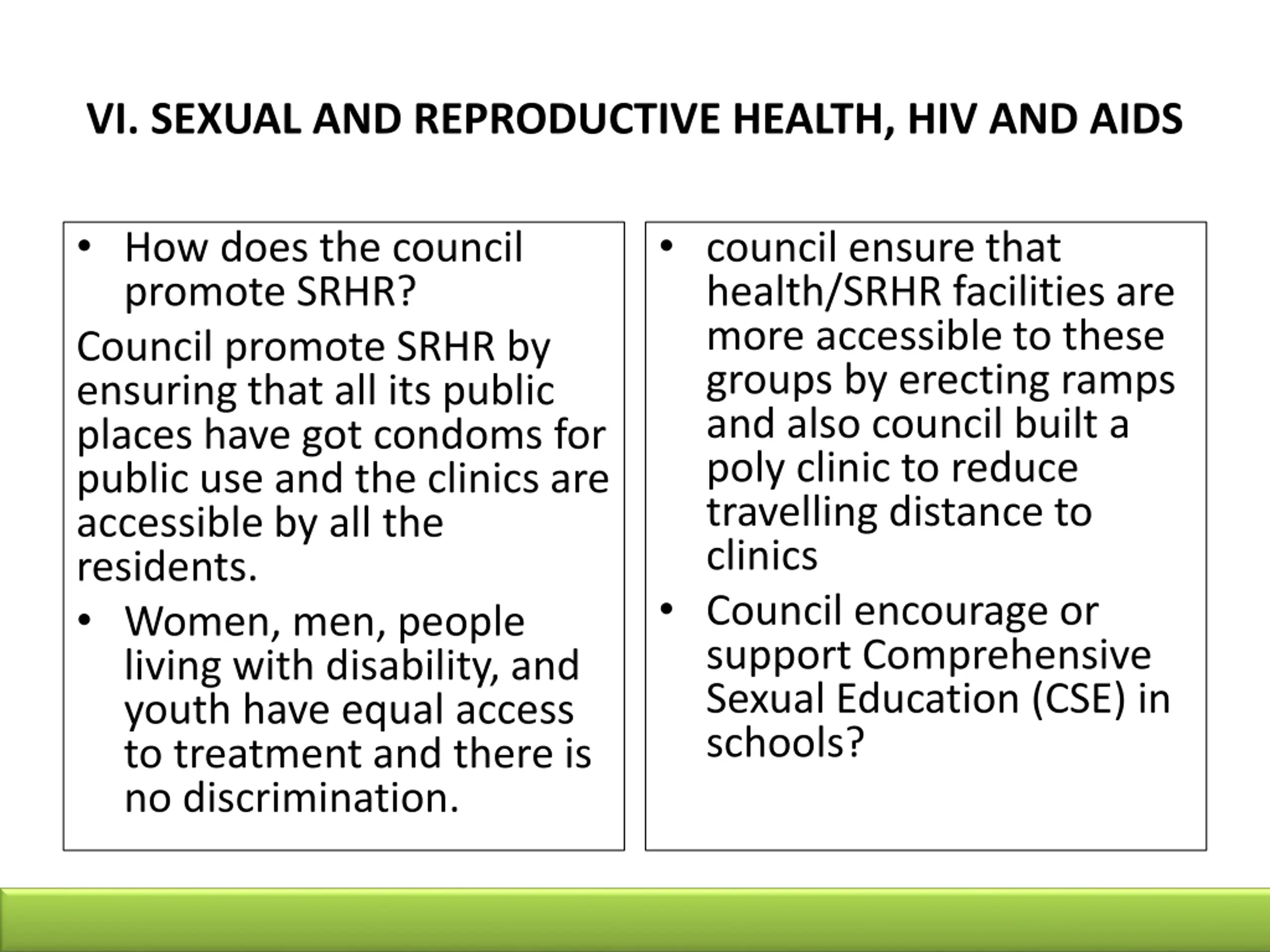 VI. SEXUAL AND REPRODUCTIVE HEALTH, HIV AND AIDS How does the council promote SRHR? Council promote SRHR by ensuring that all its public places have got condoms for public use and the clinics are accessible by all the residents. Women, men, people living with disability, and youth have equal access to treatment and there is no discrimination. council ensure that health/SRHR facilities are more accessible to these groups by erecting ramps and also council built a poly clinic to reduce travelling distance to clinics Council encourage or support Comprehensive Sexual Education (CSE) in schools?