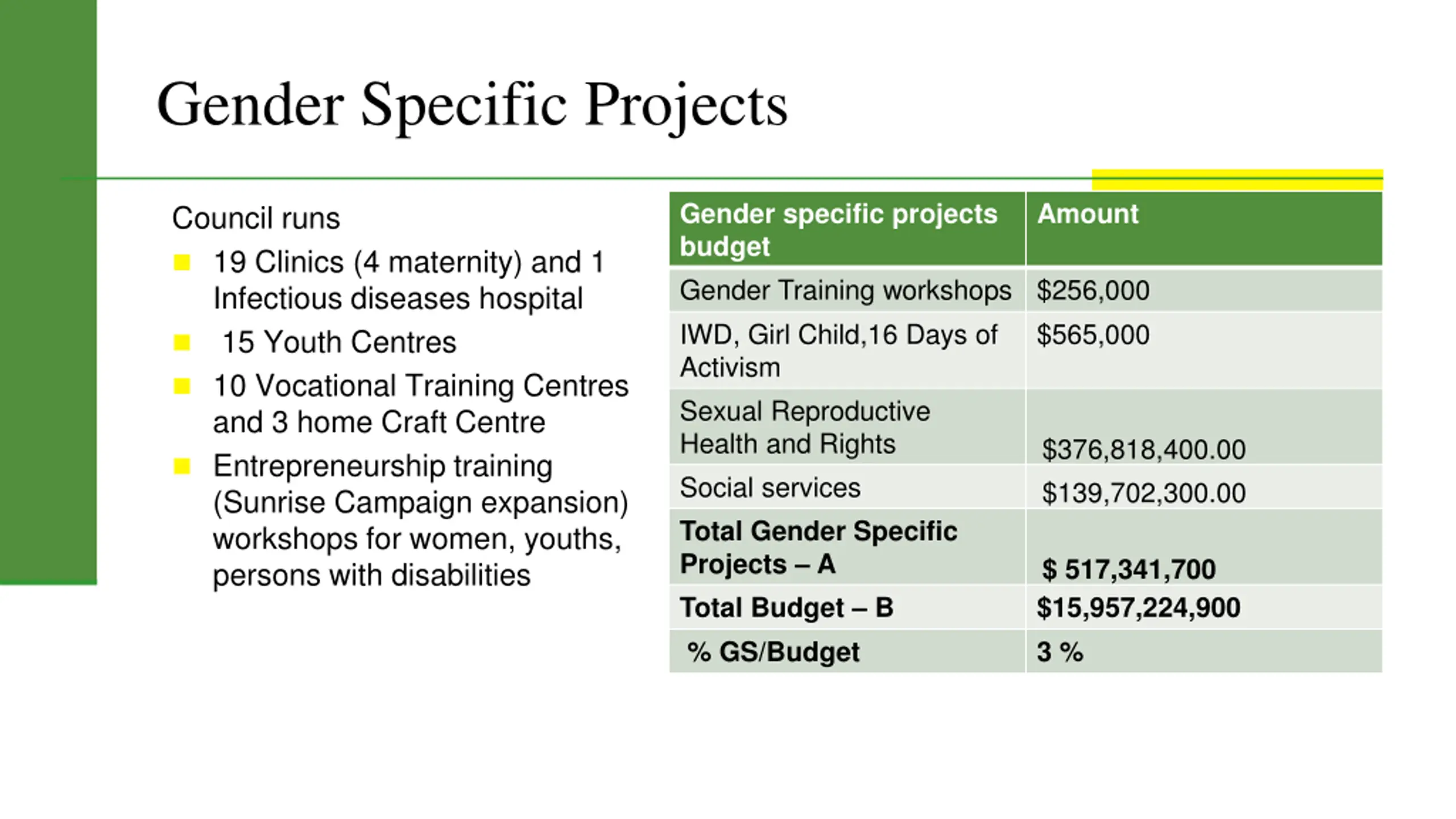 Gender Specific Projects Gender specific projects budget Gender Training workshops $256,000 IWD, Girl Child,16 Days of Activism Sexual Reproductive Health and Rights Social services Total Gender Specific Projects A Total Budget B % GS/Budget Amount Council runs 19 Clinics (4 maternity) and 1 Infectious diseases hospital 15 Youth Centres 10 Vocational Training Centres and 3 home Craft Centre Entrepreneurship training (Sunrise Campaign expansion) workshops for women, youths, persons with disabilities $565,000 $376,818,400.00 $139,702,300.00 $ 517,341,700 $15,957,224,900 3 %